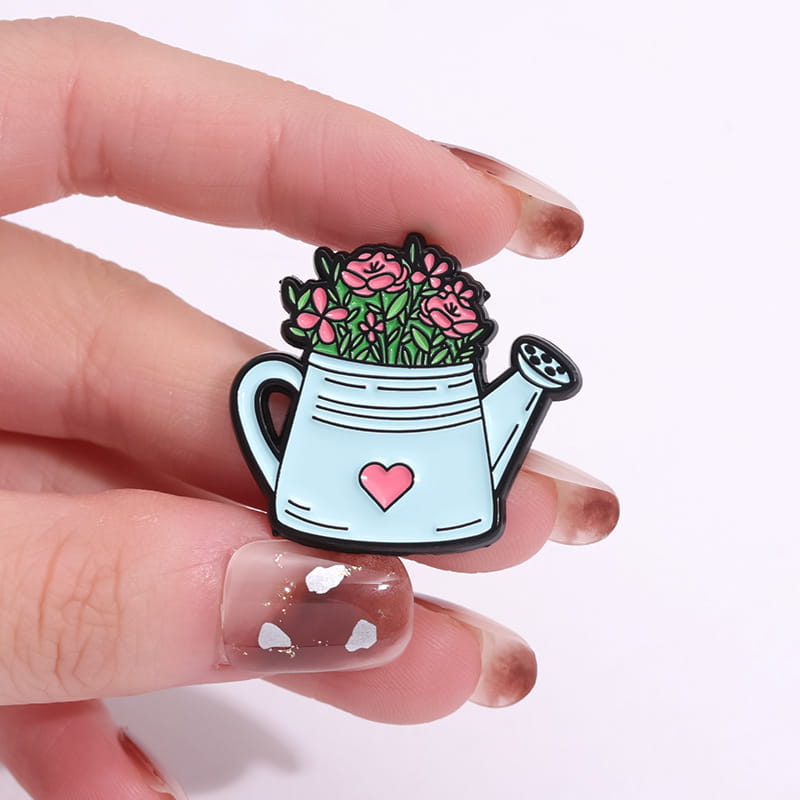 Dodaj odrobinę świeżości i natury do swojego stylu! Ta metalowa przypinka przedstawia konewkę wypełnioną kwiatami, idealna dla miłośników ogrodnictwa i romantycznych detali.