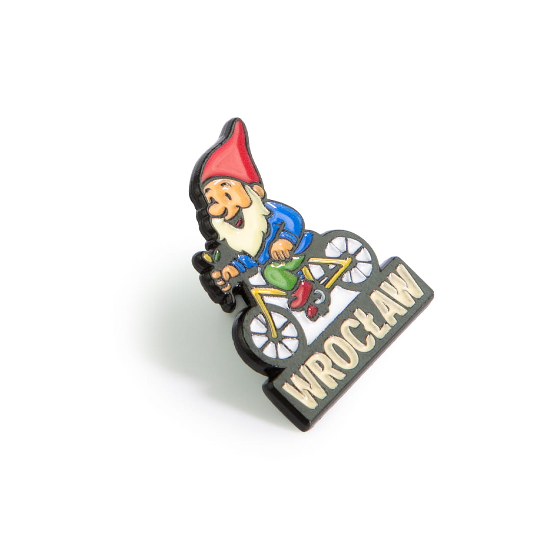 Elegancka przypinka wykonana z czarnego metalu z grafiką przedstawiającą krasnala na rowerze z napisem „Wrocław”. Doskonały dodatek do torby, plecaka, bluzy, marynarki lub innej części garderoby. Idealna dla kolekcjonerów nietypowych gadżetów.