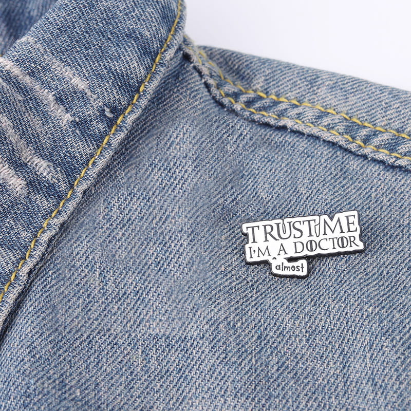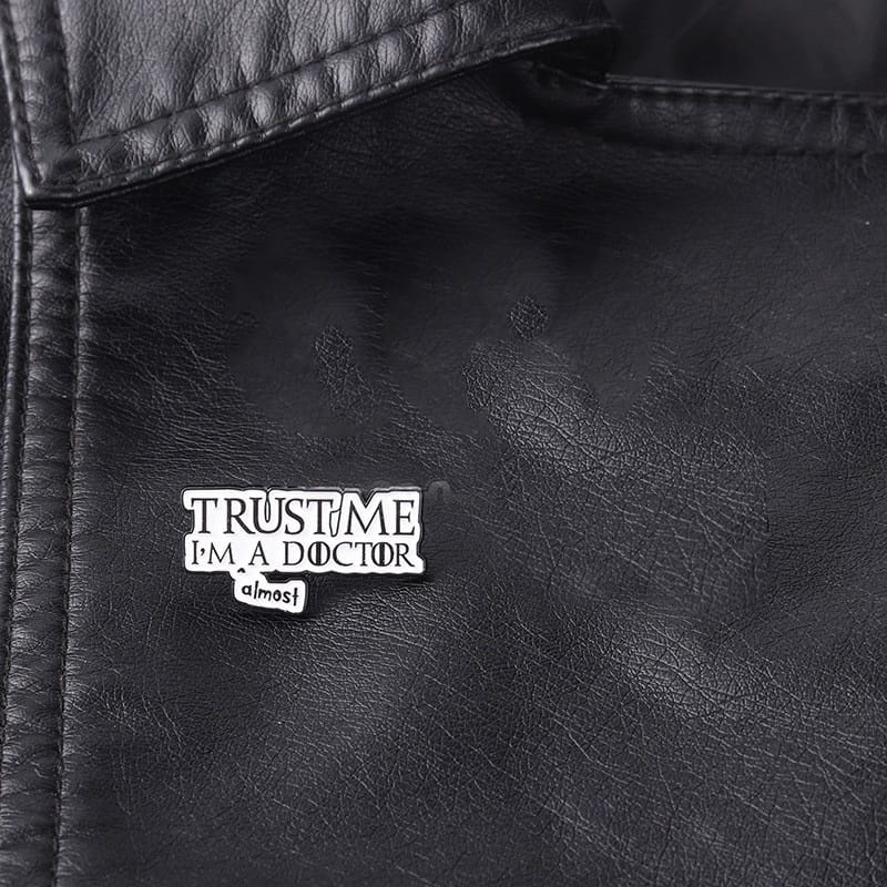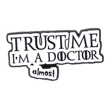 Zabawna, metalowa przypinka, idealna do dekoracji ubrania, plecaka, czy też torby dla lekarza, doktora. Prezentuje napis "Trust me I am a doctor - almost". Zakończona gumową nakładką na 'pin', która świetnie mocuje przypinkę do garderoby, dobrze przylegając do materiału.