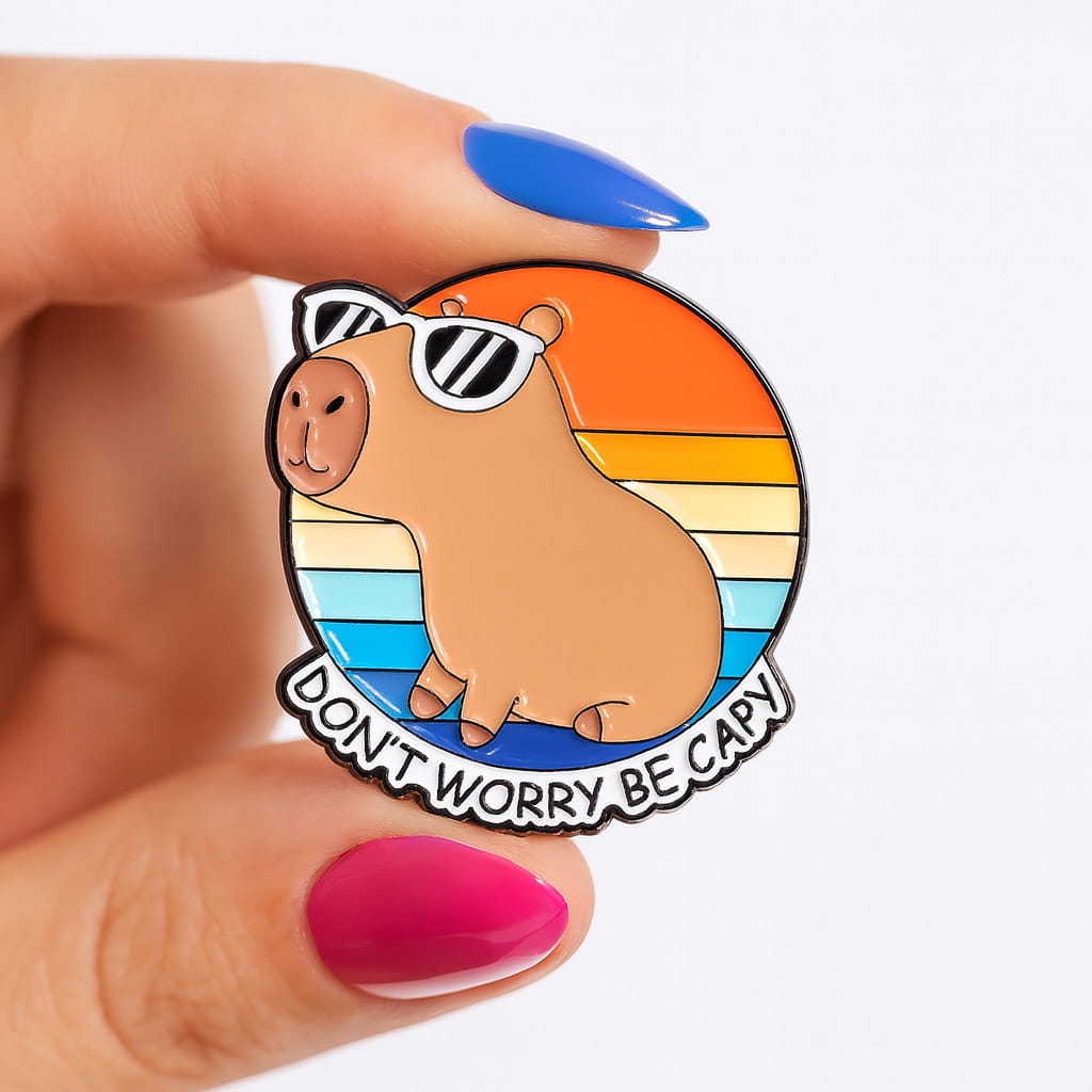 Przypinka "Don’t Worry Be Capy" – Kapibara w okularach Wnieś wakacyjny luz do swojego stylu! Ta metalowa przypinka przedstawia kapibarę w modnych okularach przeciwsłonecznych na tle kolorowego zachodu słońca z napisem „Don’t Worry Be Capy”. Idealna dla osób, które kochają relaks i dobry humor.
