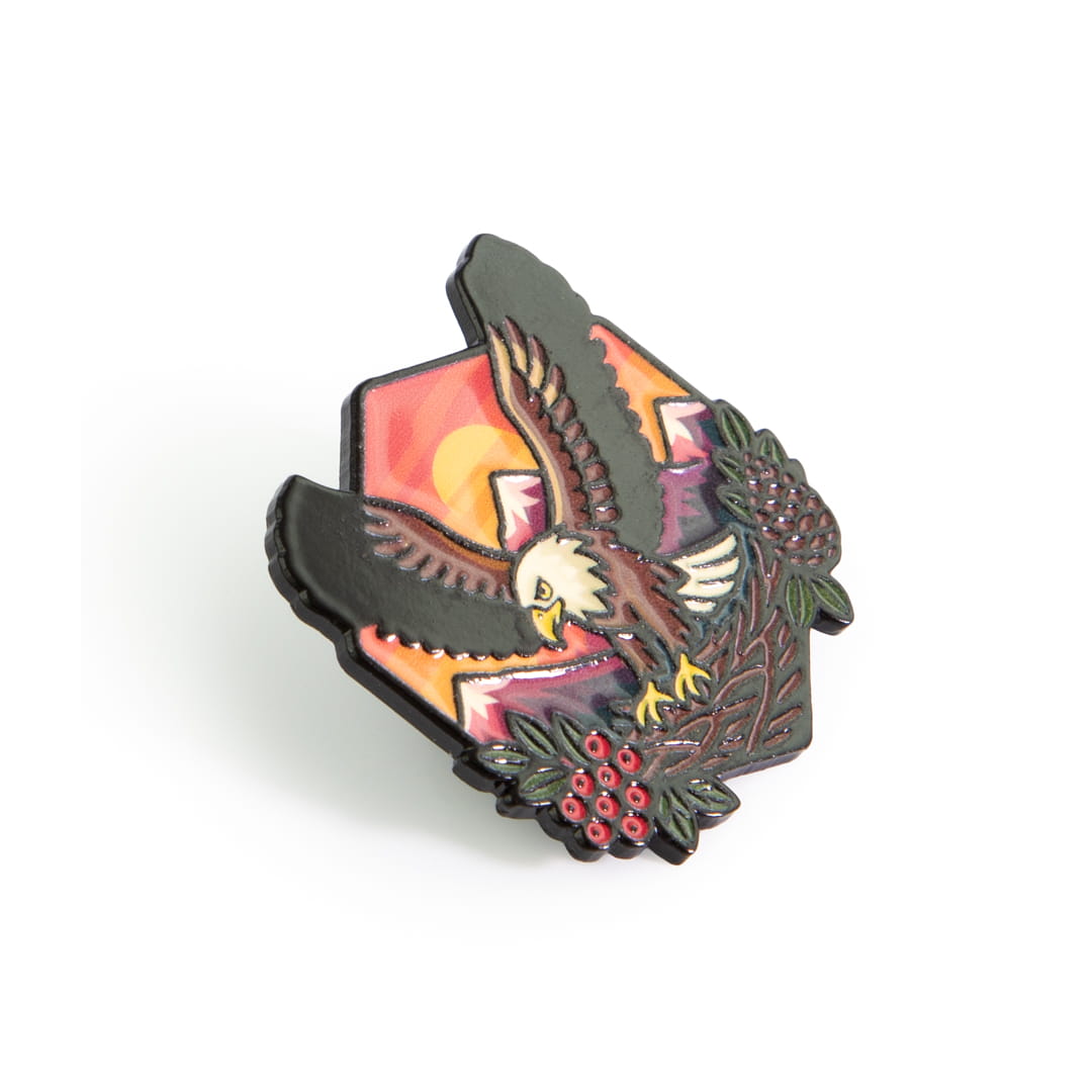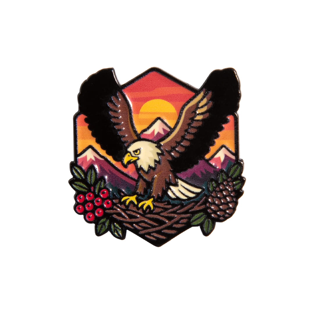 Elegancka przypinka wykonana z czarnego metalu z grafiką przedstawiającą orła w gnieździe na tle zachodzącego słońca i gór. Doskonały dodatek do torby, plecaka, bluzy, marynarki lub innej części garderoby. Idealna dla kolekcjonerów nietypowych gadżetów.
