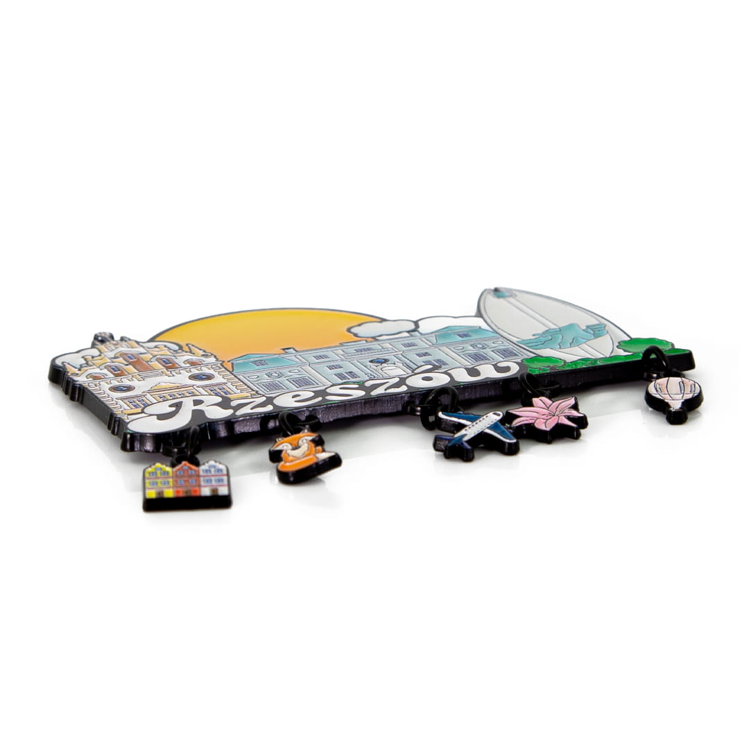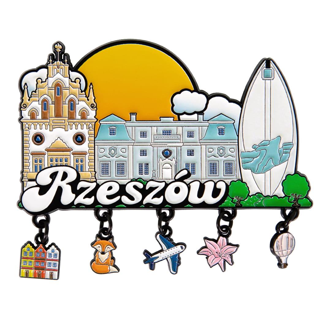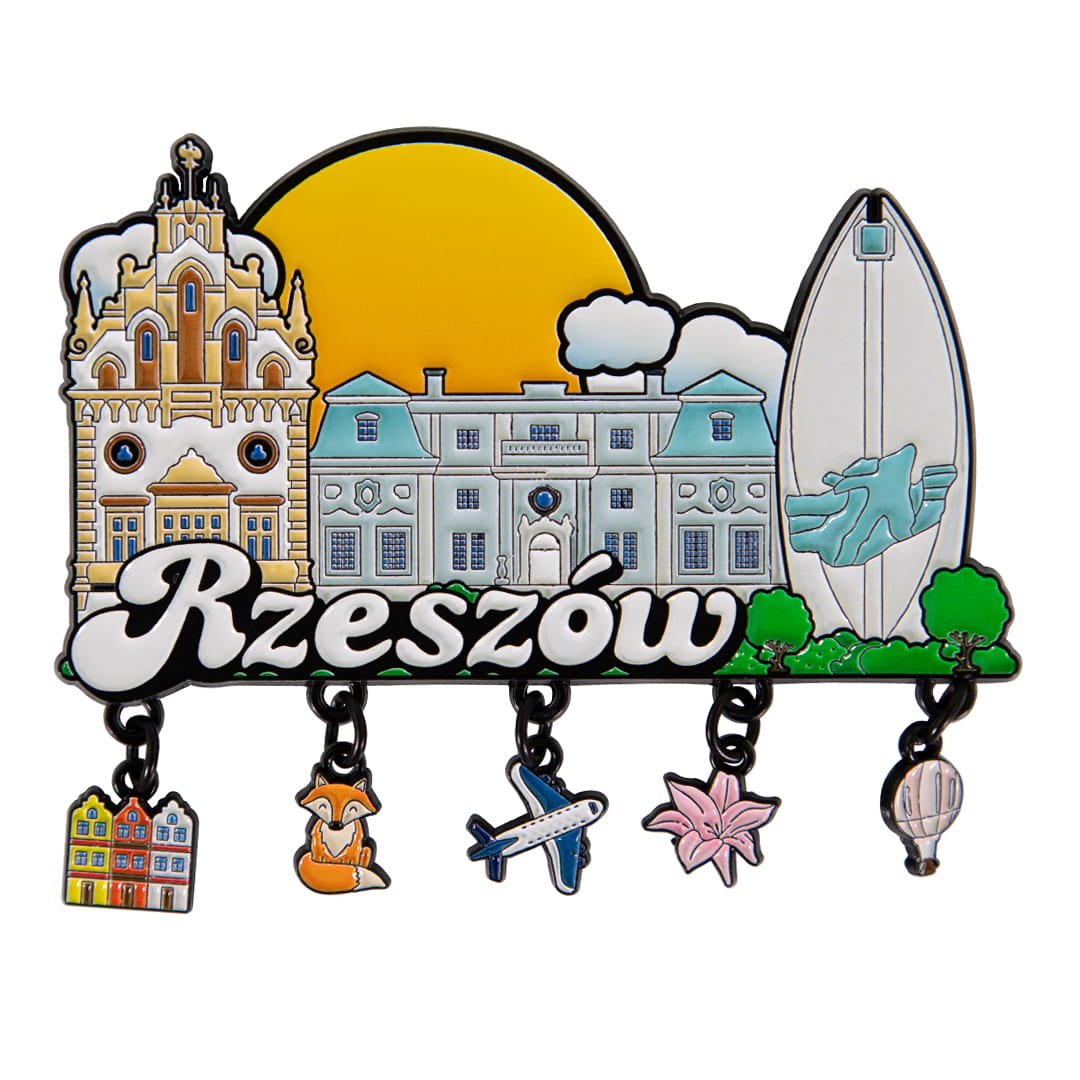 Metalowy, bardzo kolorowy magnes przedstawiający charakterystyczne dla Rzeszowa budowle oraz wyraźny napis Rzeszów. Magnes przyzdobiony jest zawieszkami powiązanymi motywem z miejscowością, a wśród nich między innymi kamieniczki i balon.