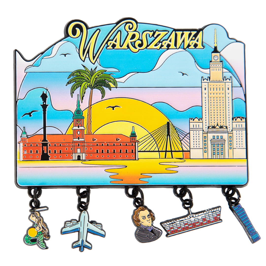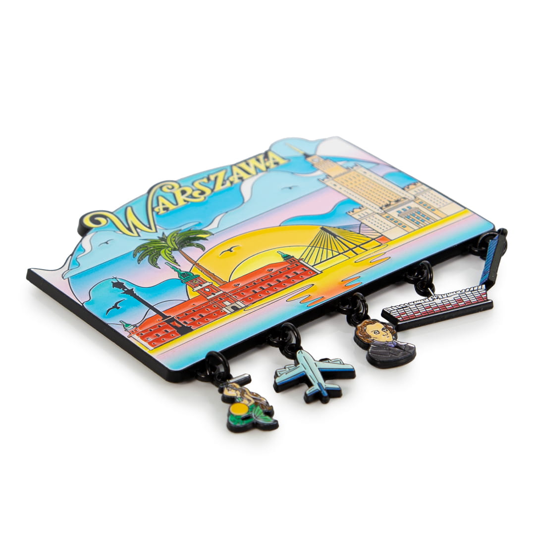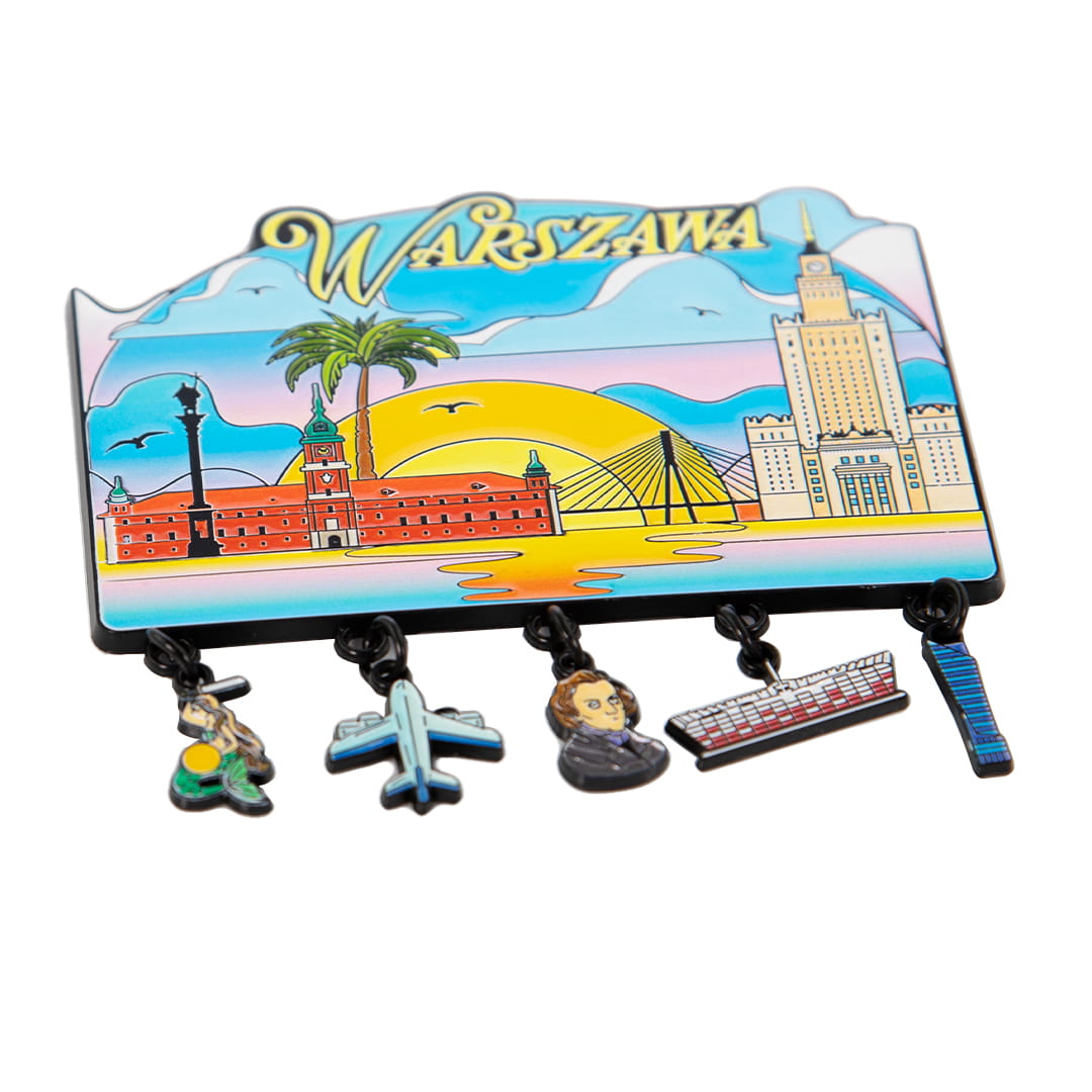 Metalowy, bardzo kolorowy magnes przedstawiający charakterystyczne dla Warszawy budowle oraz wyraźny napis Warszawa. Magnes przyzdobiony jest zawieszkami powiązanymi motywem z miejscowością, a wśród nich między innymi syrenka, stadion narodowy i podobizna Chopina.