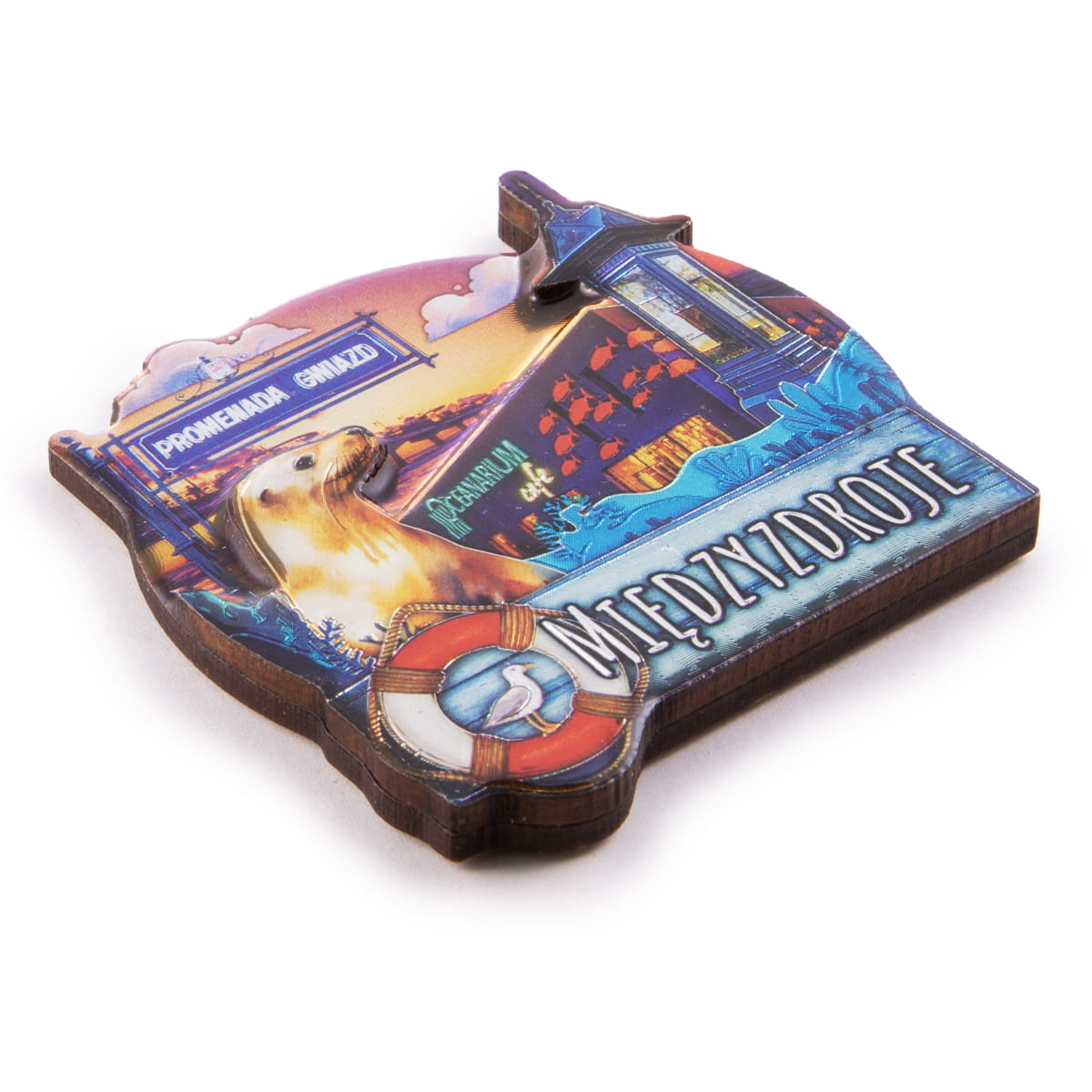 Wykonany z MDF dwuwarstwowy magnes metalizowany, przedstawiający panoramę Międzyzdrojów. Wśród prezentowanych na magnesie elementów zauważyć można między innymi oceanarium i promonedę gwiazd. Widoczny jest na nim też wyraźny napis "Międzyzdroje". Front magnesu zalany jest żywicą epoksydową zapewniającą trwałość kolorów i nadającą połysk. Na rewersie umieszczona jest duża, wysokiej klasy folia magnetyczna zapewniająca trwałe, bezpieczne umocowanie pamiątki na metalowej powierzchni.