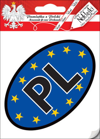 Naklejka na samochód ze znakiem PL, otoczonym gwiazdkami UE. Naklejka na wewnętrzną stronę szyby - klej na stronie zadrukowanej.