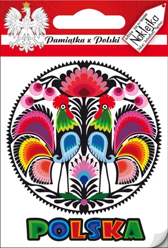 Naklejka - łowicki wzór z kogutami i napisem Polska.