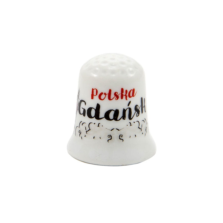 Naparstek ceramiczny z nadrukiem prezentującym Zieloną Bramę oraz napisy "Polska" i "Gdańsk".