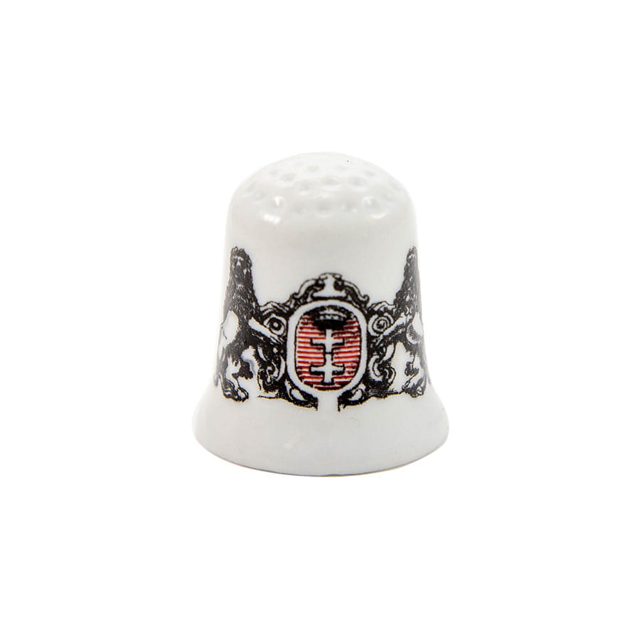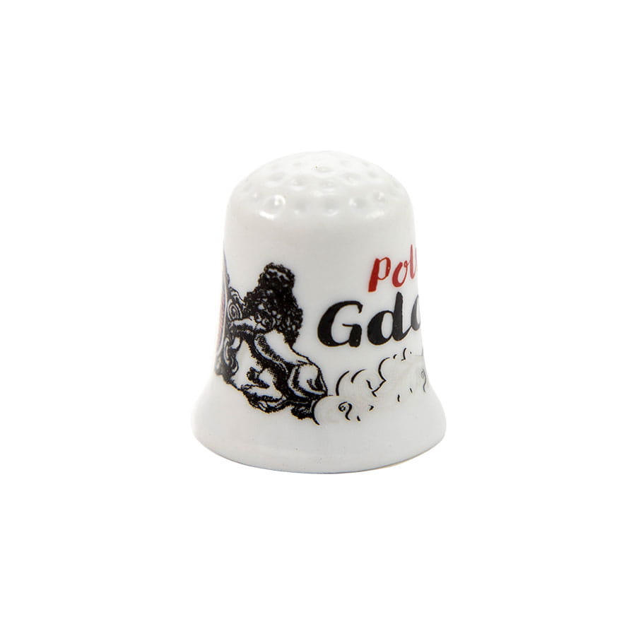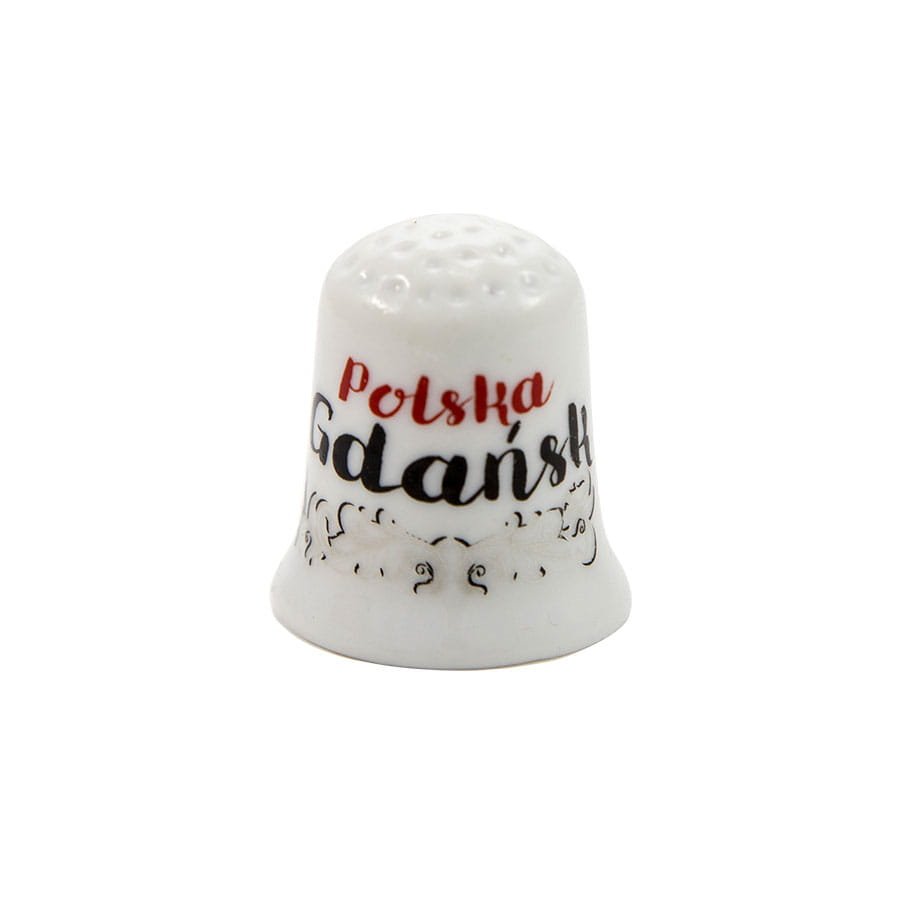 Naparstek ceramiczny z nadrukiem prezentującym herb Gdańska wraz z napisami "Polska" i "Gdańsk".