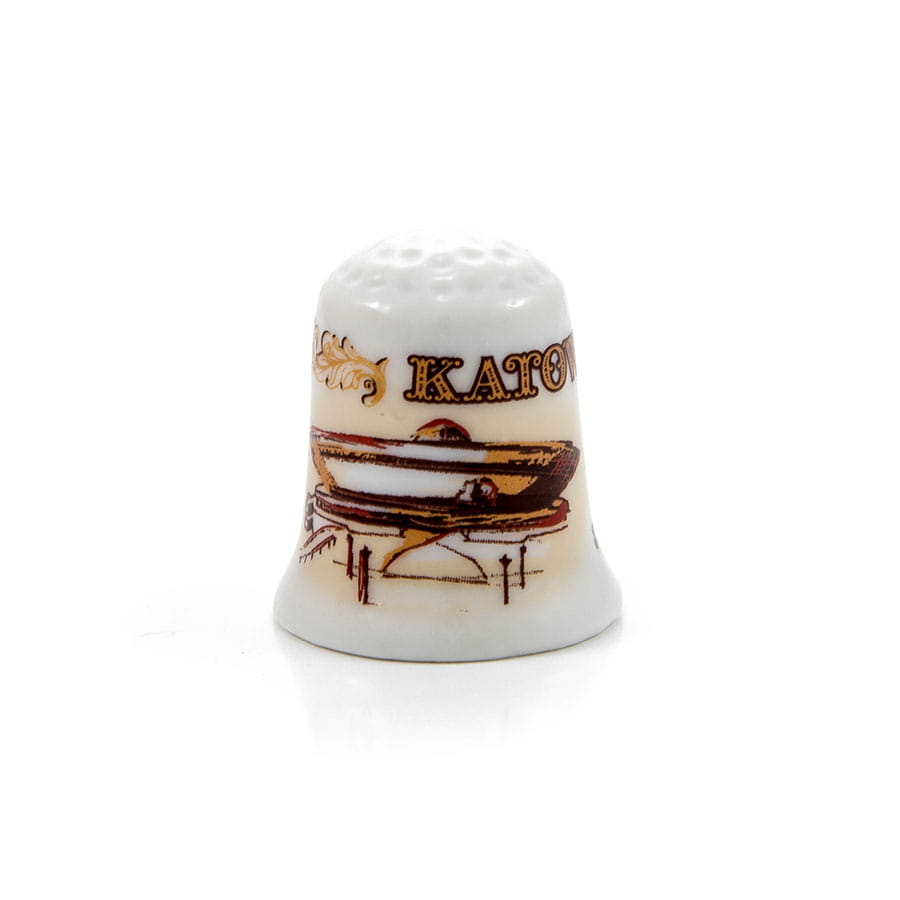 Naparstek ceramiczny z nadrukiem prezentującym herb Katowic i Spodek wraz z podpisami i wyraźnym napisem "Katowice".
