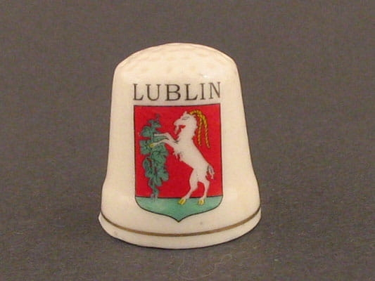 Naparstek ceramiczny z nadrukowanym herbem miasta Lublin.