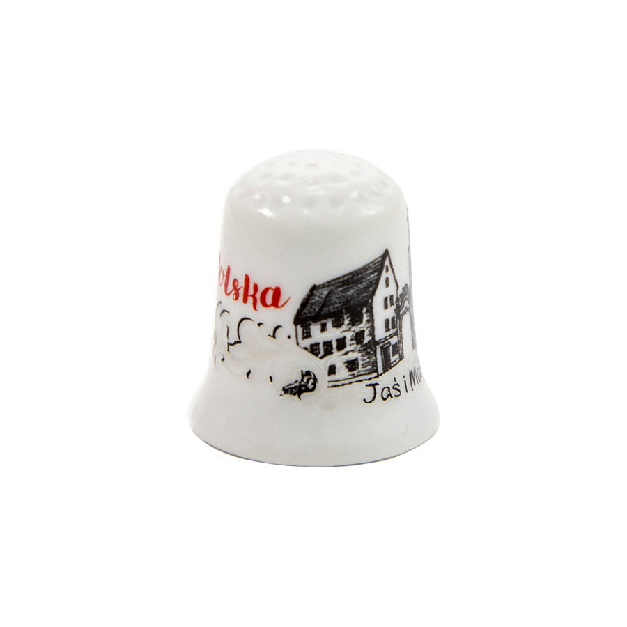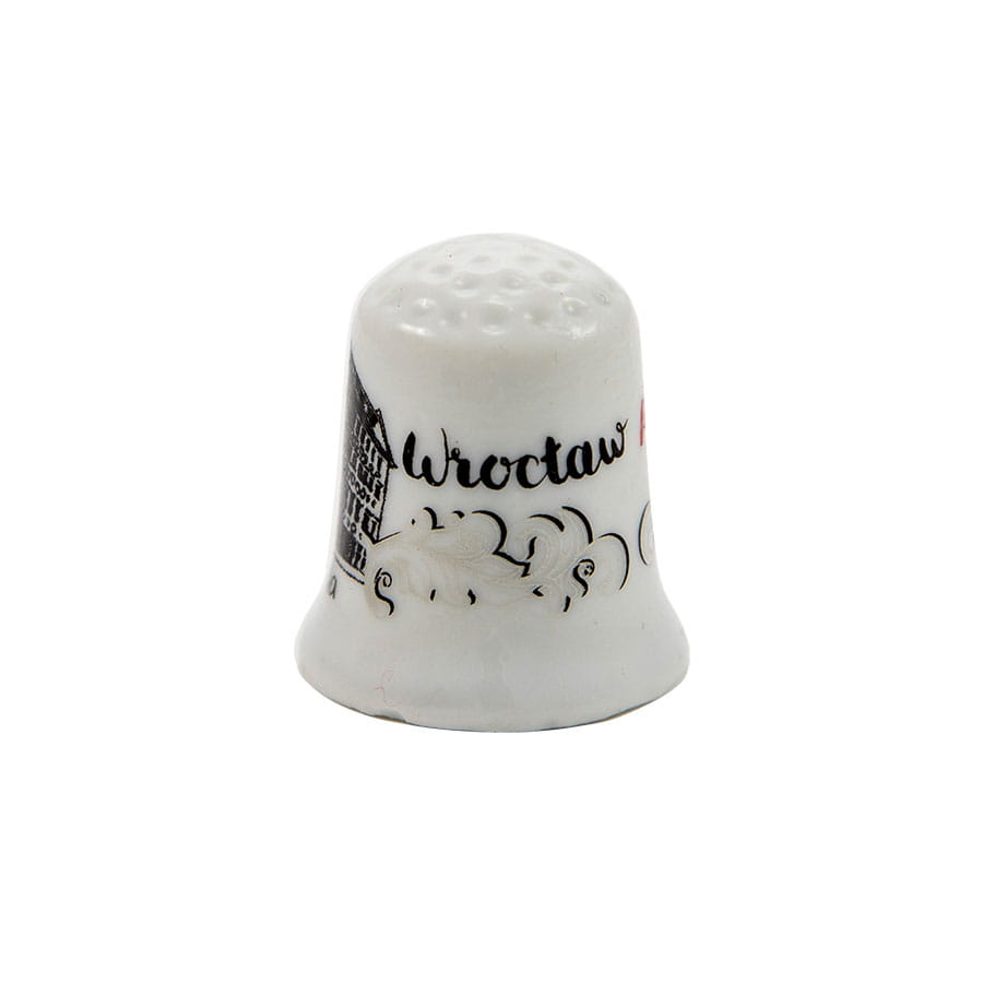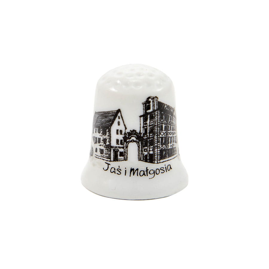 Naparstek ceramiczny z nadrukiem prezentującym wrocławskie kamienice Jaś i Małgosia wraz z napisami "Polska" i "Wrocław" oraz podpisem "Jaś i Małgosia".