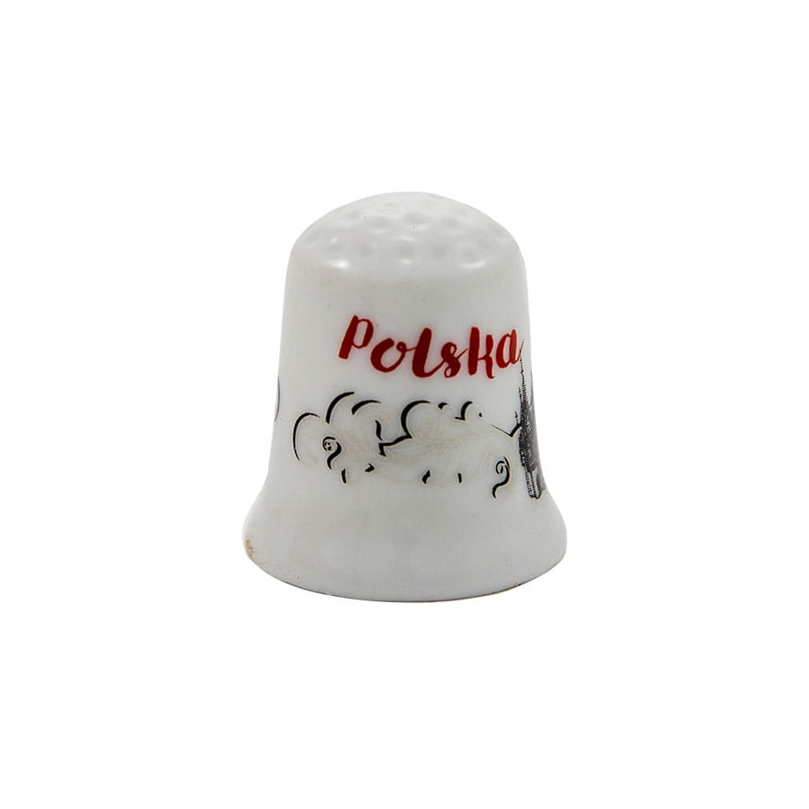 Naparstek ceramiczny z nadrukiem prezentującym wrocławski Ratusz wraz z napisami "Polska" i "Wrocław".