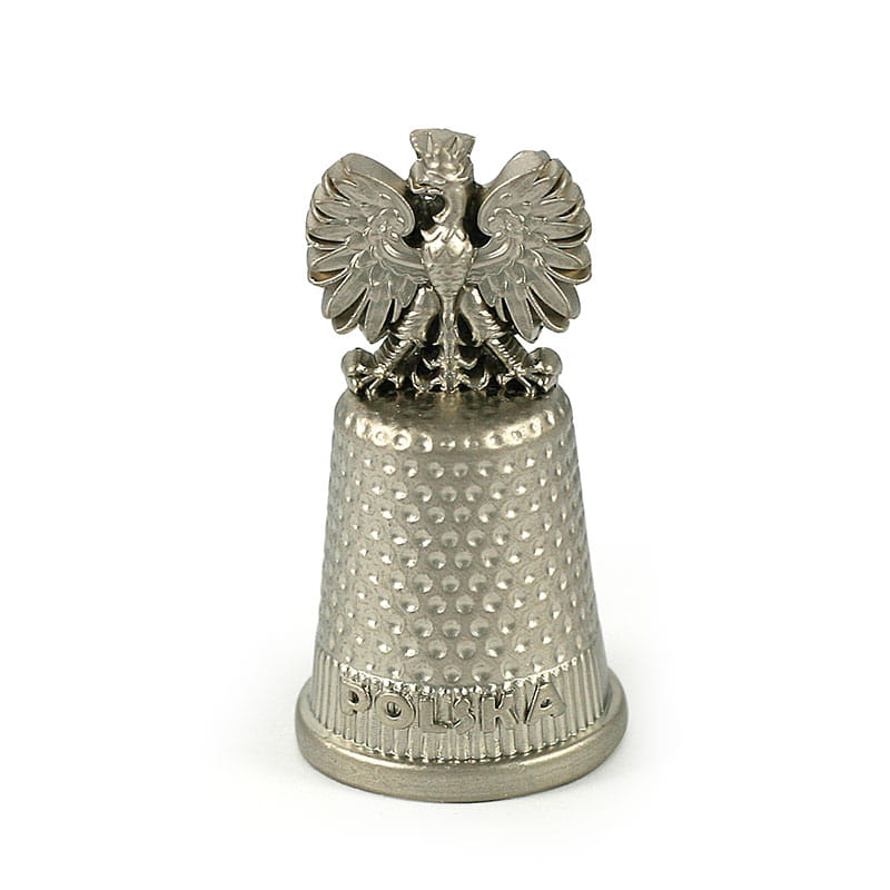 Naparstek metalowy z napisem Polska i nadbudową w kształcie orła.
