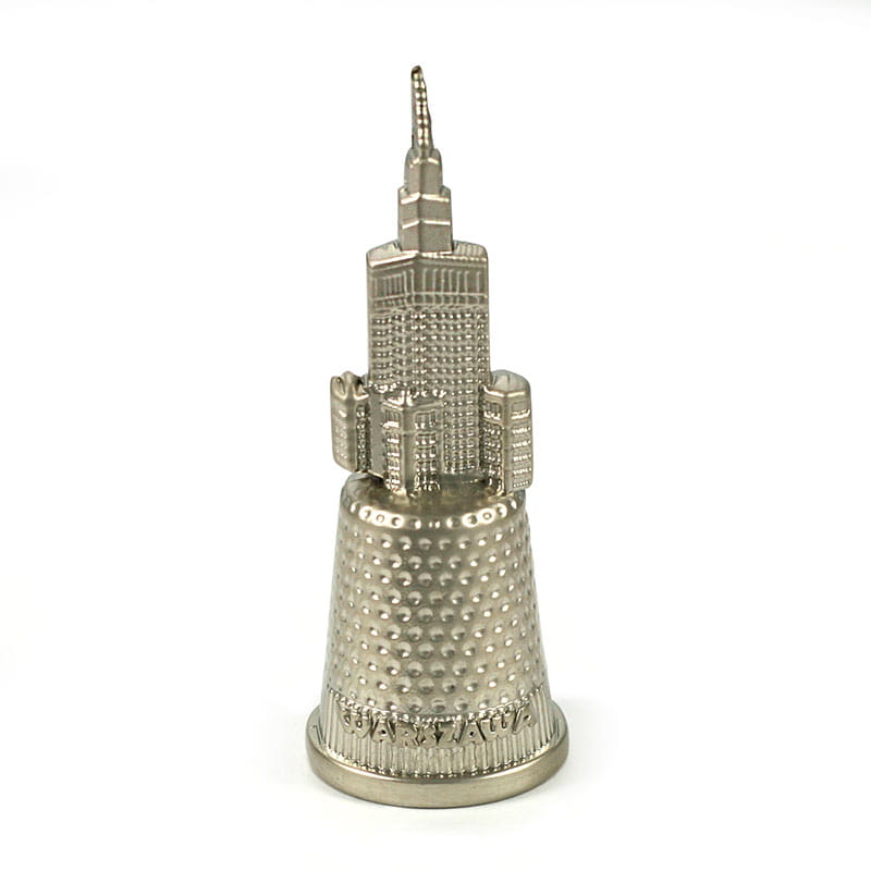 Naparstek metalowy z napisem Warszawa oraz nadbudową w kształcie Pałacu Kultury i Nauki.