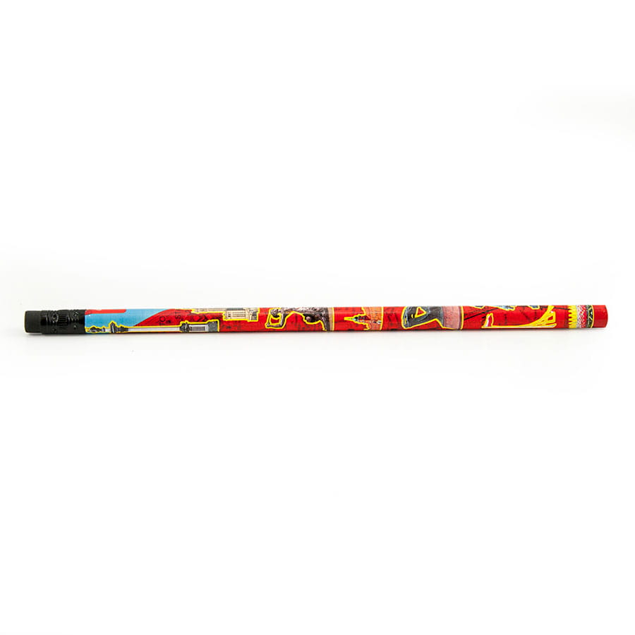 Ołówek HB z gumką, na którym umieszczono najbardziej charakterystyczne miejsca i budowle warszawskie.