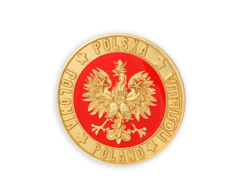 Przypinka w postaci złotego Orła na czerwonym tle, otoczonego napisami Polska.