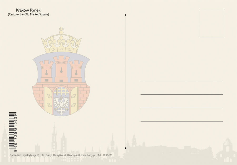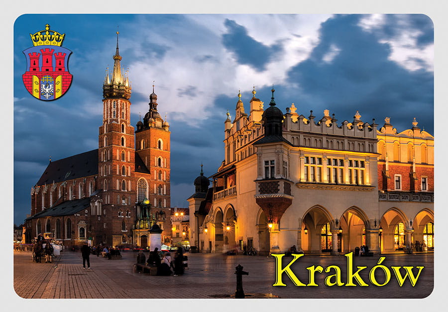 Trójwymiarowa pocztówka z napisem Kraków, przedstawiająca Kościół Mariacki i Sukiennice nocą.