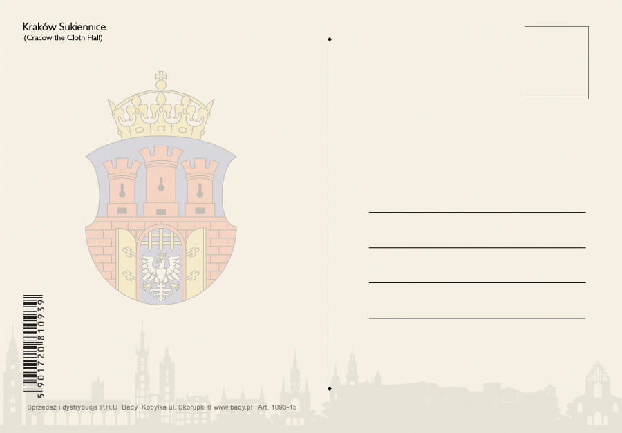 Trójwymiarowa pocztówka z napisem Kraków, przedstawiająca Sukiennice z lotu ptaka.
