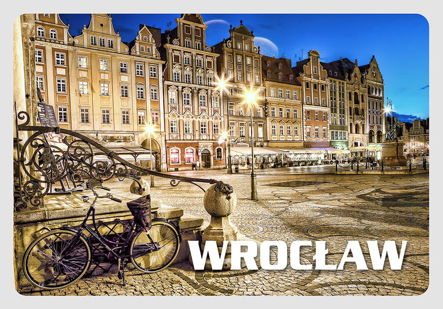 Trójwymiarowa pocztówka z napisem Wrocław, przedstawiająca widok na Rynek, schody i rower.