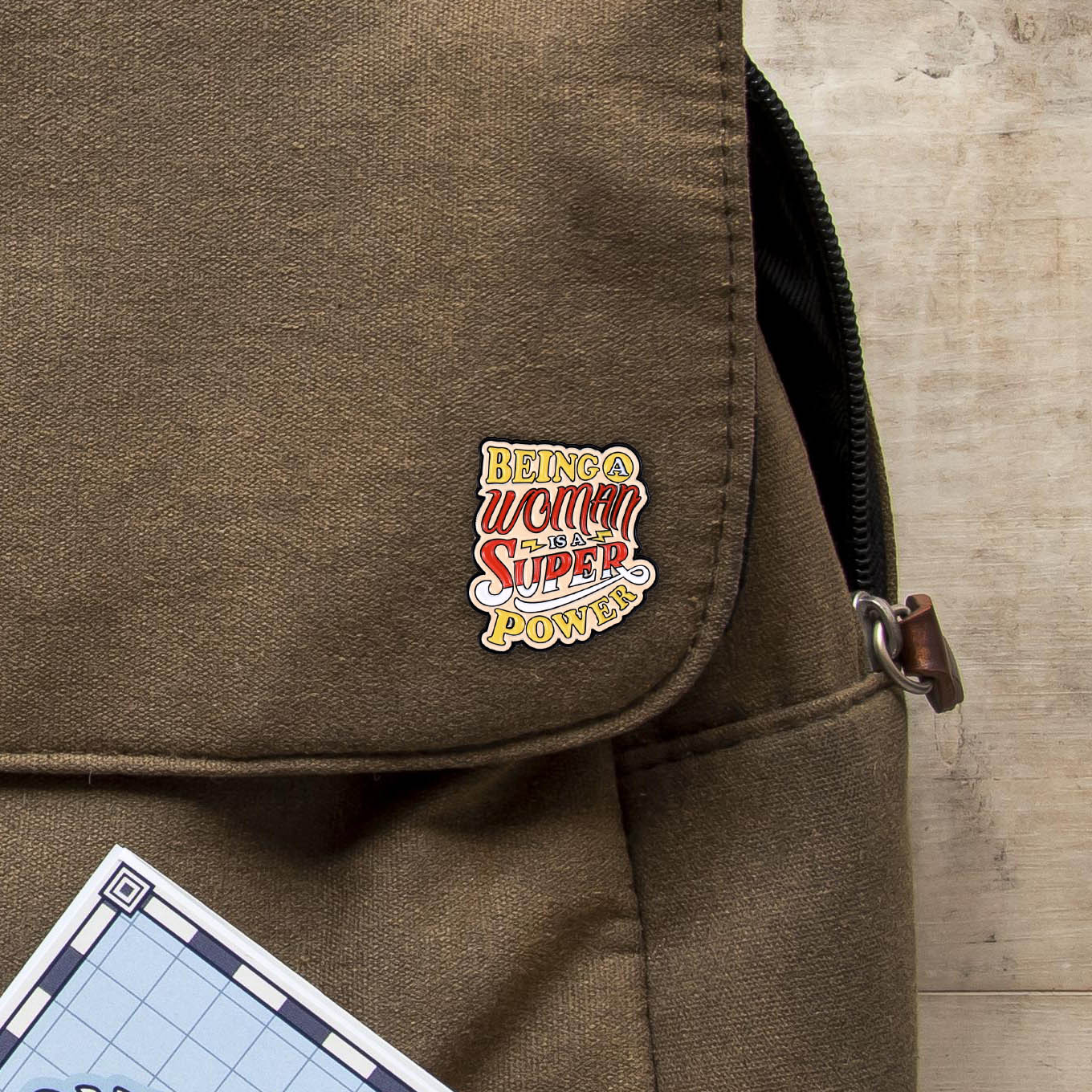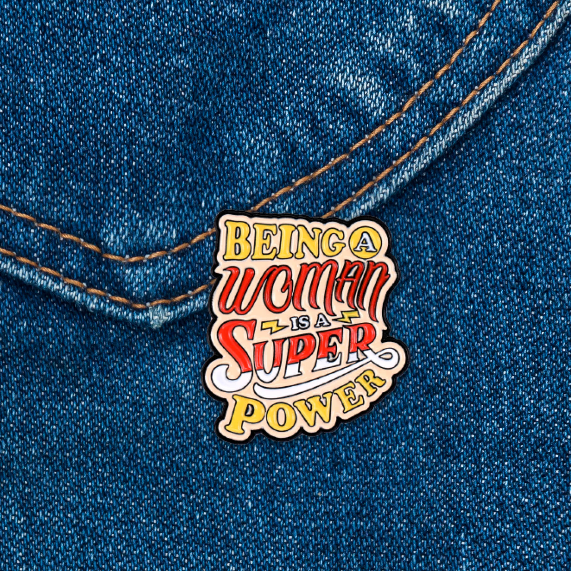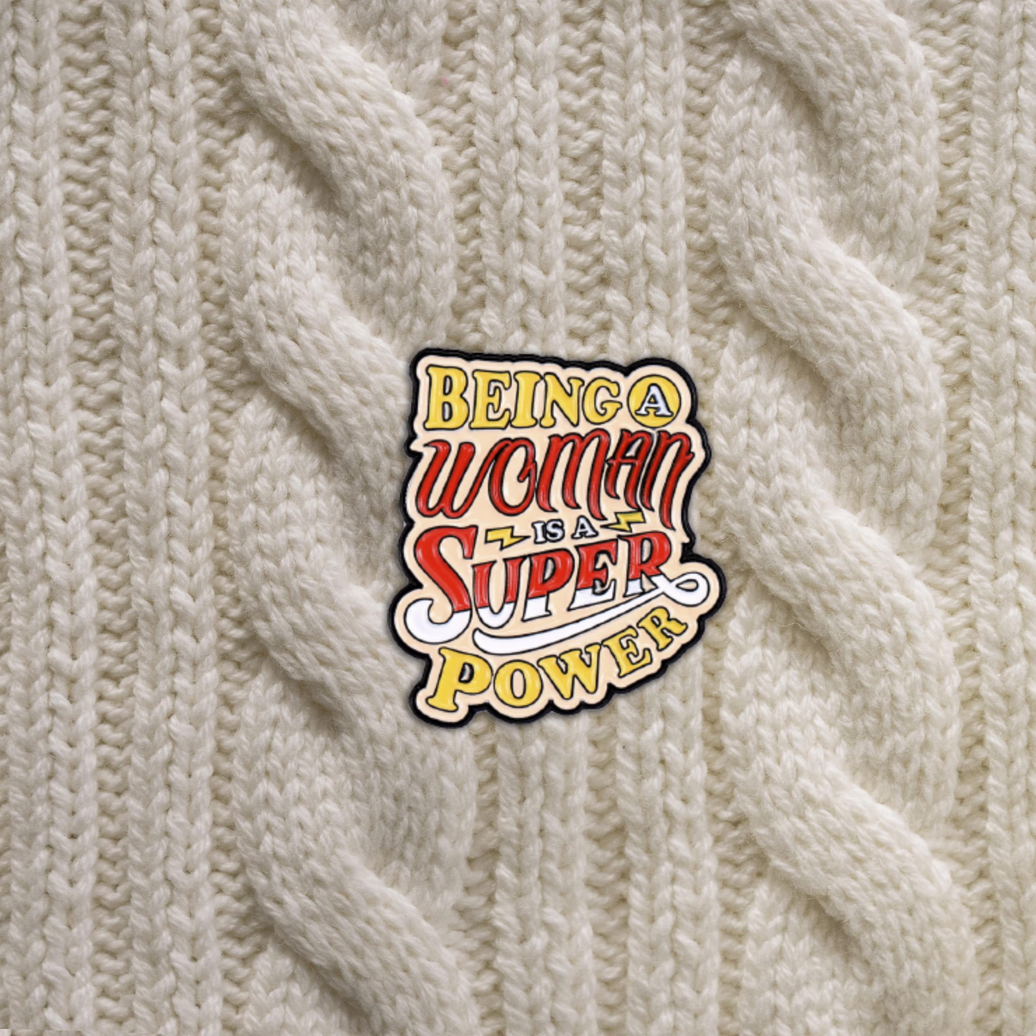 Metalowa przypinka, idealna do dekoracji ubrania, plecaka, czy też torby. Prezentuje ona wielokolorowy napis ""Being a woman is a super power"". Jest to doskonały gadżet dla kobiet chcących podkreślić swoją pewność siebie i poczucie ważności, feministek i działaczek walczących o wyzowolenie się z patriarchatu. Przypinka ma charakter humorystyczny. Zakończona gumową nakładką na 'pin', która świetnie mocuje przypinkę do garderoby, dobrze przylegając do materiału.