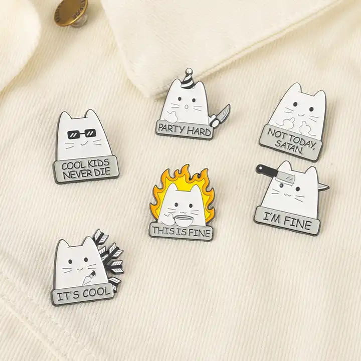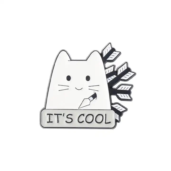 Kolorowa, metalowa przypinka przedstawiająca uśmiechniętego kota z masą strzał wbitych w plecy i napisem "It's Cool".