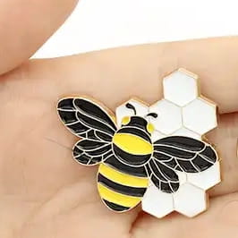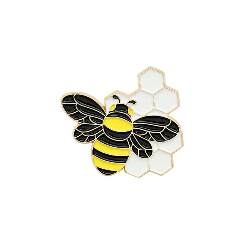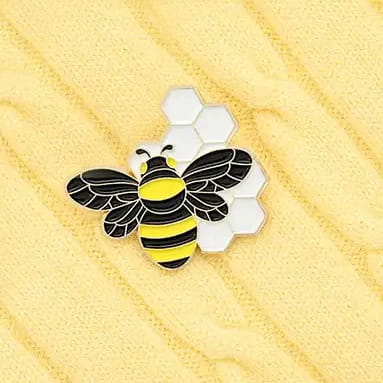 Kolorowa, metalowa przypinka przedstawiająca pszczołę na plastrze miodu.