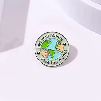 Kolorowa, metalowa przypinka przedstawiająca planetę Ziemia w dłoniach na okręgu z napisem "Love Your mama, save the planet".