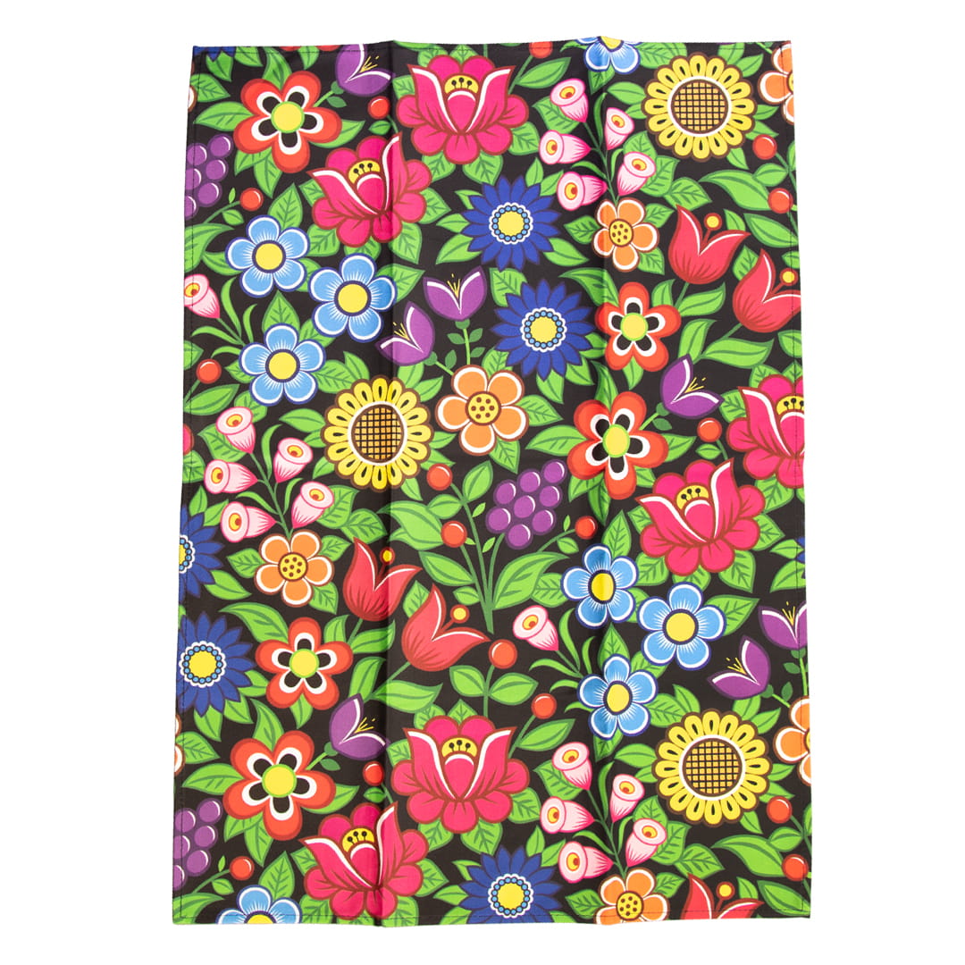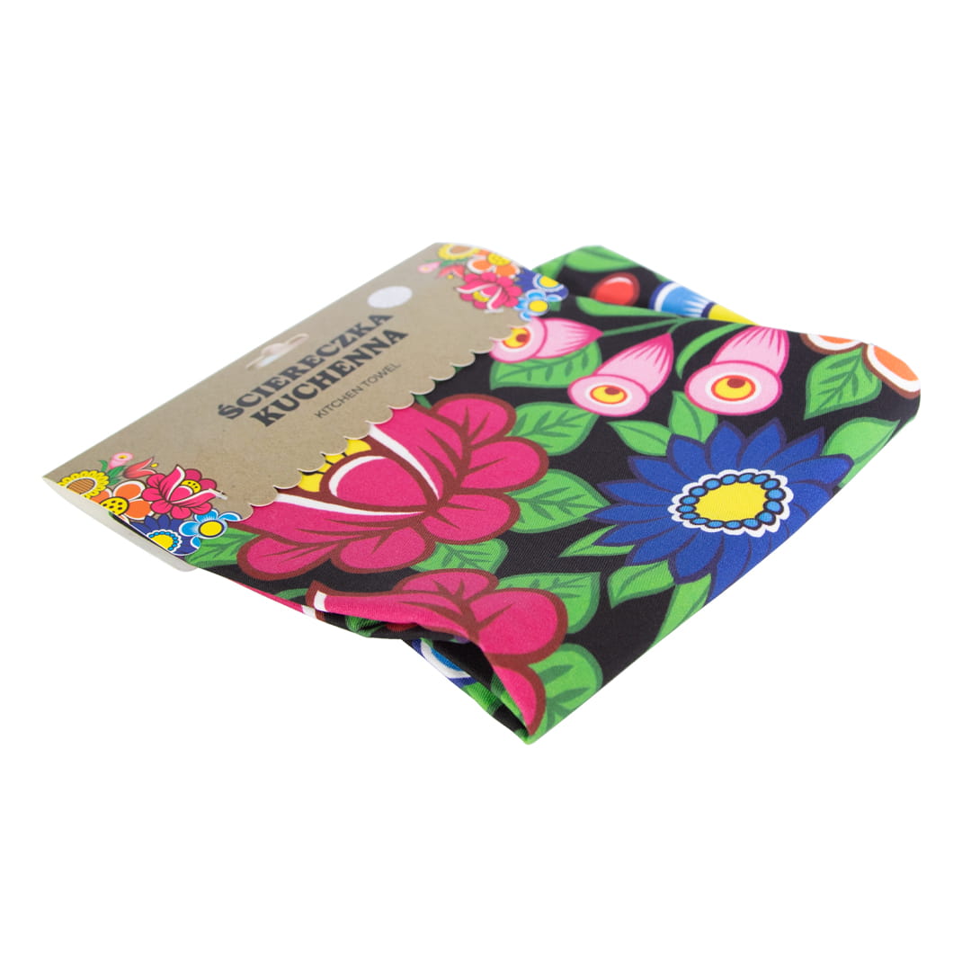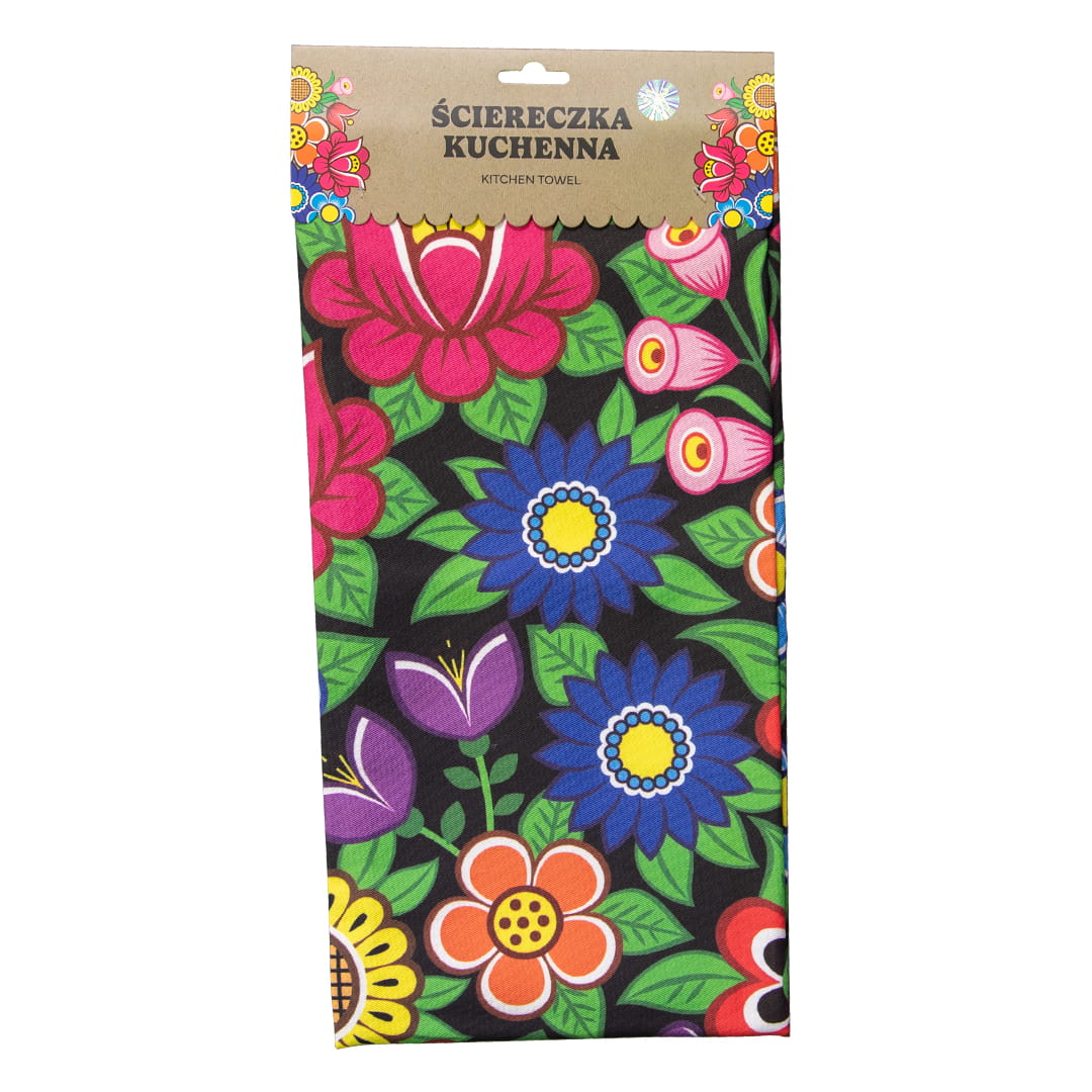 Duża bawełniana ścierka kuchenna z pięknym, kolorowym, wyrazistym wzorem kwiatowym nawiązującym do polskich tradycji. Folklorystyczny motyw umieszczony jest na ściereczce jednostronnie, a obszyte krawędzie zapewniają trwałość i wytrzymałość produktu.