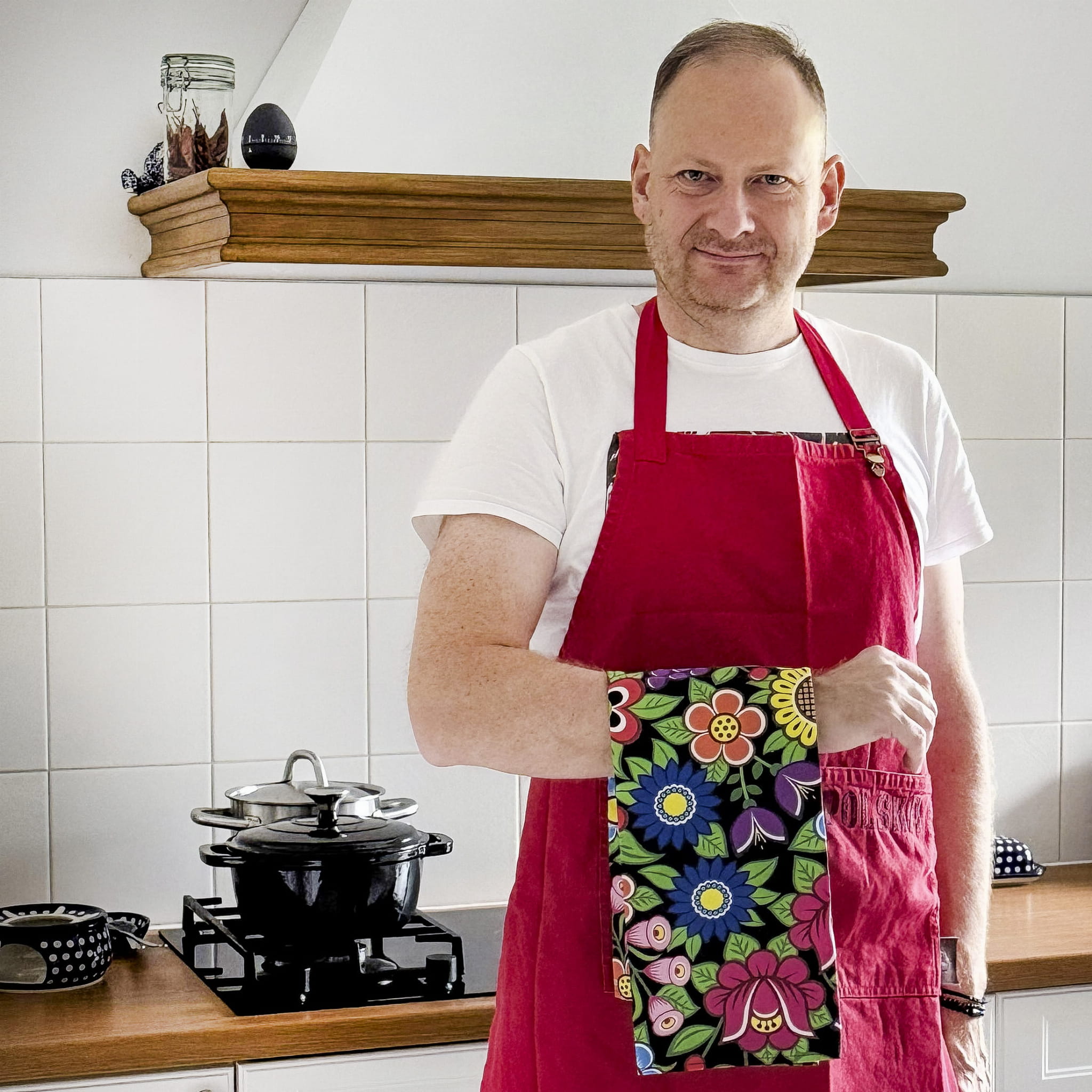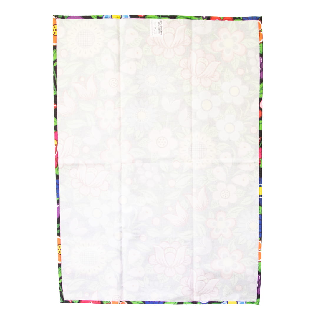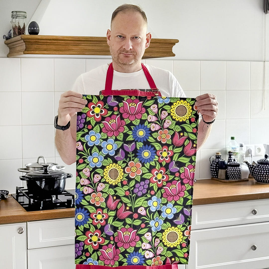 Duża bawełniana ścierka kuchenna z pięknym, kolorowym, wyrazistym wzorem kwiatowym nawiązującym do polskich tradycji. Folklorystyczny motyw umieszczony jest na ściereczce jednostronnie, a obszyte krawędzie zapewniają trwałość i wytrzymałość produktu.