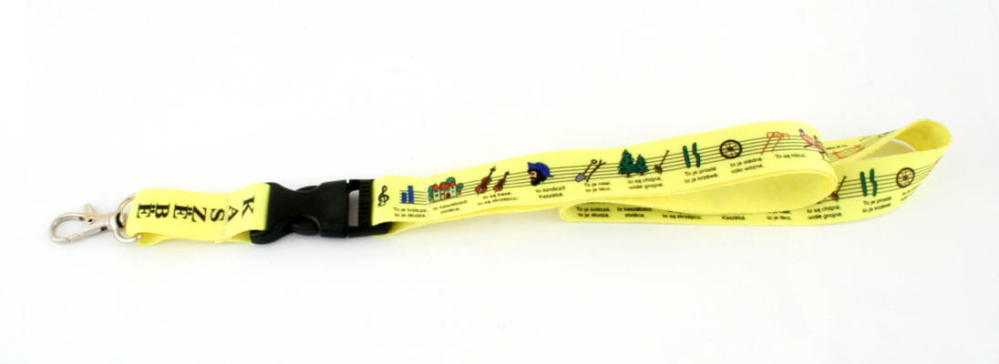 Wykonana z poliestru żółta smycz z karabińczykiem i plastikową złączką umożliwiającą odpięcie końcówki smyczy. Smycz zdobiona jest Kaszubskimi wzorami oraz (Kaszëbë note) jedną z wersji poniższej Kaszubskiej rymowanki:
