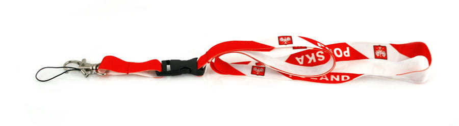 Biało-czerwona smycz wykonana z poliestru. Posiada karabińczyk do przypinania kluczy oraz pętelkę do zawieszenia telefonu. Końcówka smyczy opatrzona jest plastikową złączką umożliwiającą odpinanie. Na smyczy znajduje się polskie godło oraz napisy "Polska" i "Poland".