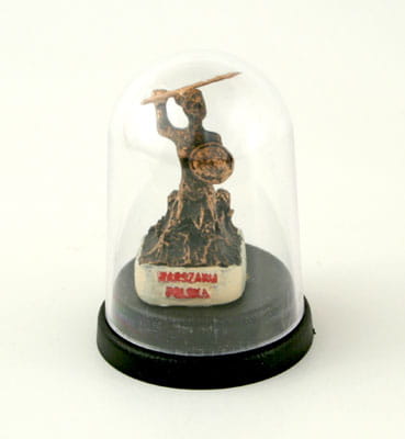Miniaturowa statuetka, w postaci Warszawskij Syrenki na postumencie, zamknięta pod plastikową kopułą.