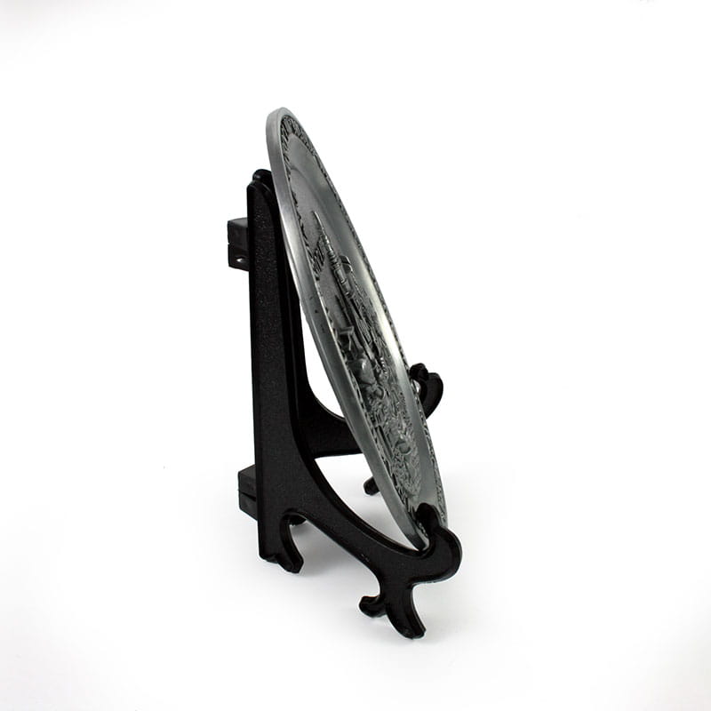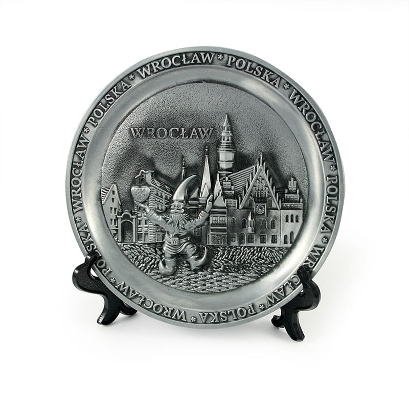Pamiątkowy, ozdobny talerzyk, z wyrzeźbionym krasnalem na tle wrocławskich zabytków. Na obręczy widnieje napis Wrocław oraz Polska.