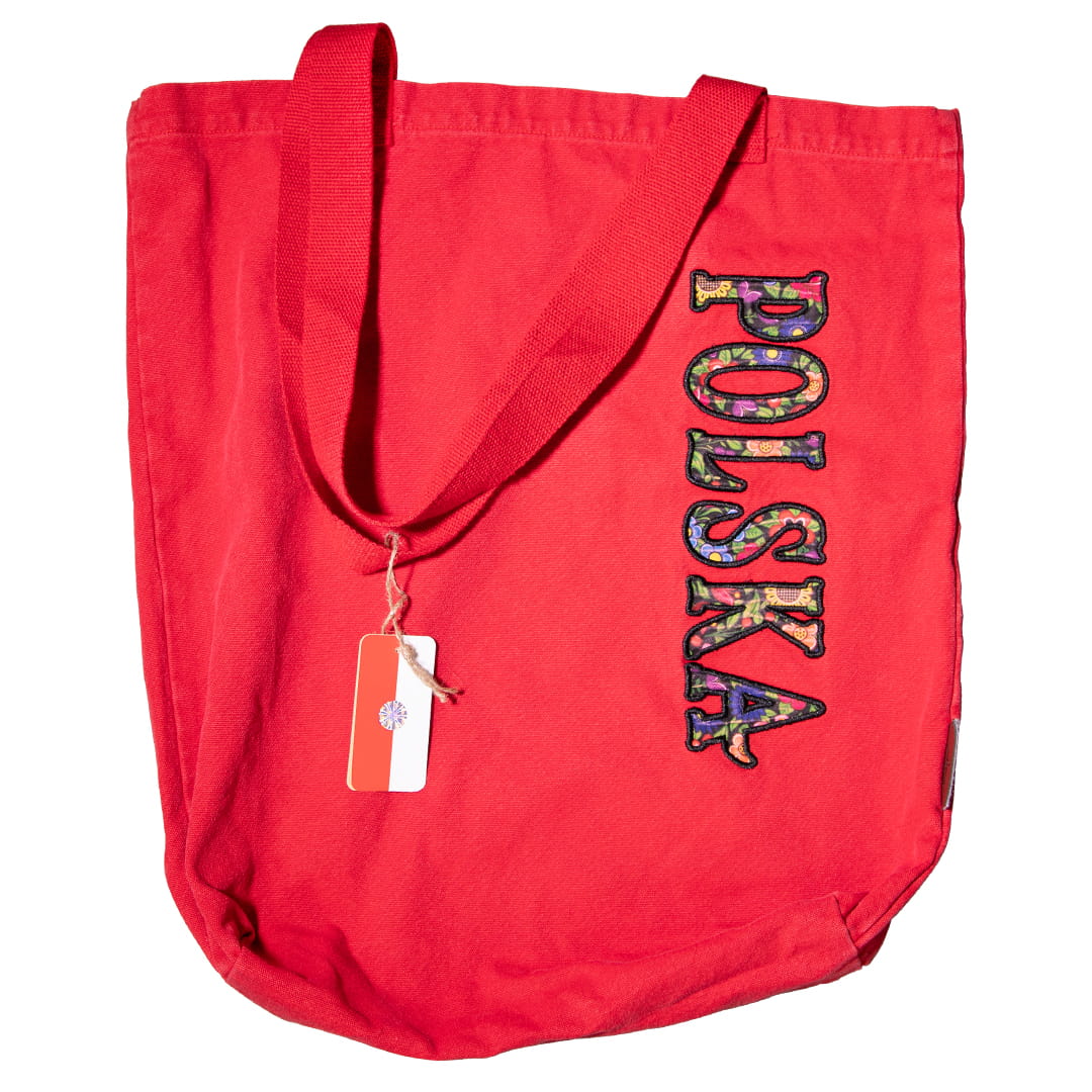 Duża, czerwona, materiałowa torba premium wykonana w stu procentach z bawełny. Na froncie torby naszyty jest duży, wyraźny napis "Polska". Rozmiar torby 45x50 cm plus rączka/pasek o długości 31cm.