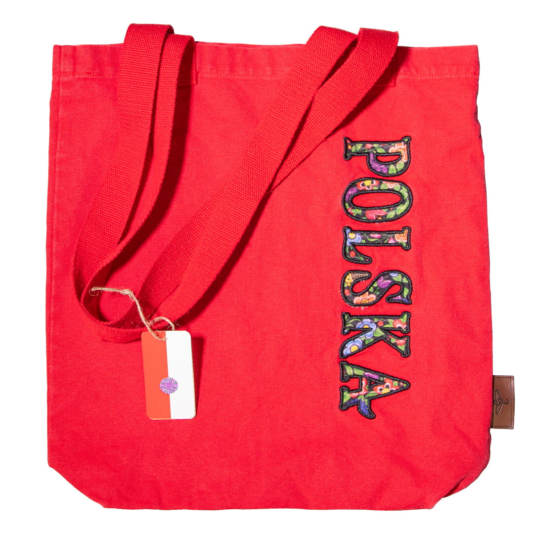 Czerwona materiałowa torba premium wykonana w stu procentach z bawełny. Na froncie torby naszyty jest duży, wyraźny napis "Polska". Rozmiar torby 36x40 cm plus rączka/pasek o długości 31cm.