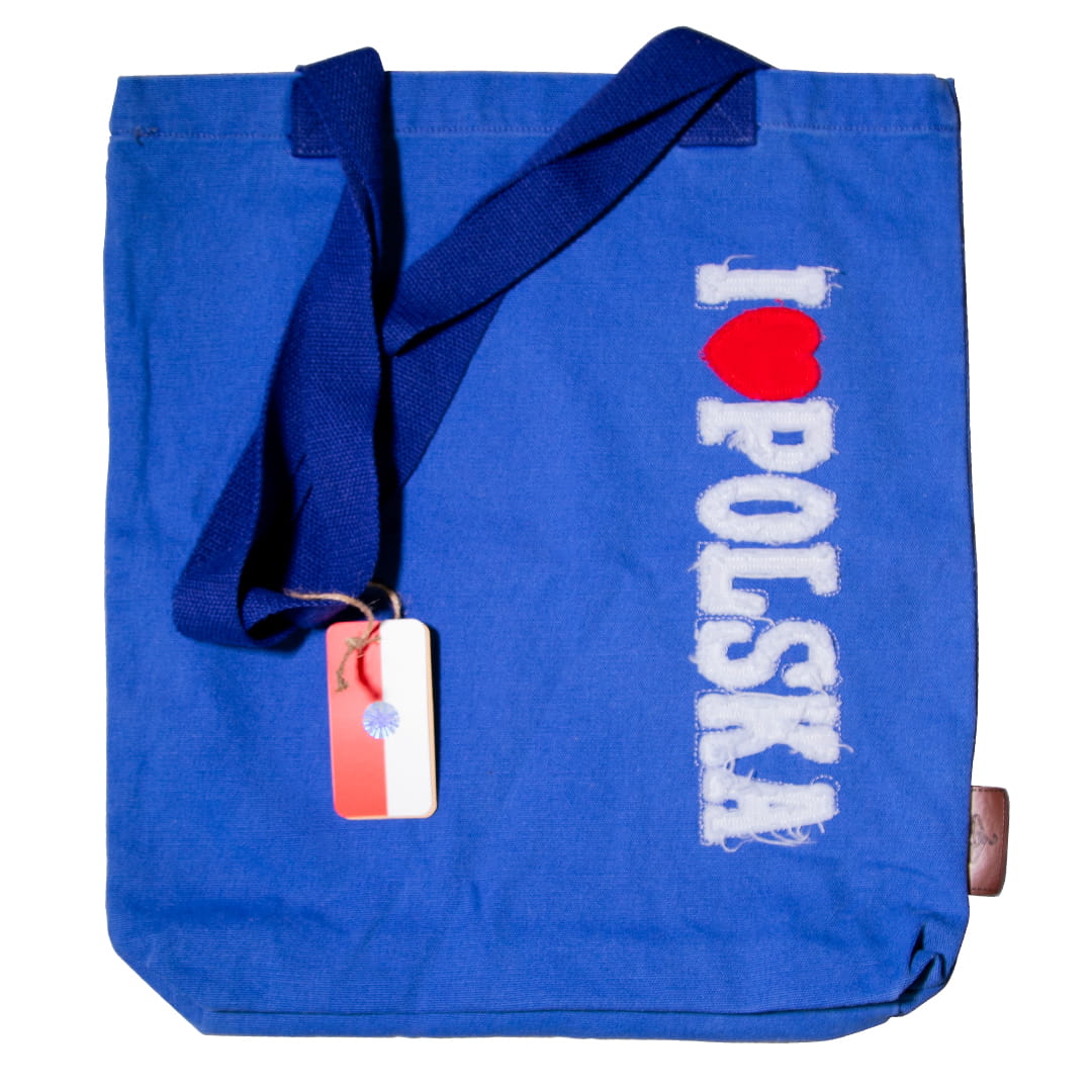 Niebieska materiałowa torba premium wykonana w stu procentach z bawełny. Na froncie torby naszyty jest duży, wyraźny napis "I ♥ Polska". Rozmiar torby 36x40 cm plus rączka/pasek o długości 31cm.