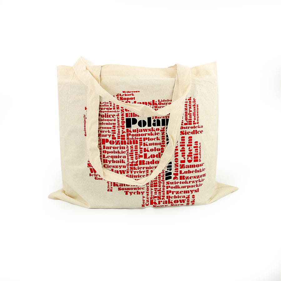 Bawełniana torba na zakupy w kolorze naturalnym z czerwonymi nazwami polskich miast i województw, które układają się w kształt naszego kraju. Czarną czcionką wyróżniony jest napis "Poland" i "Warszawa". Nadruk wykonany jest metodą sitodruku dzięki czemu jest niespieralny.