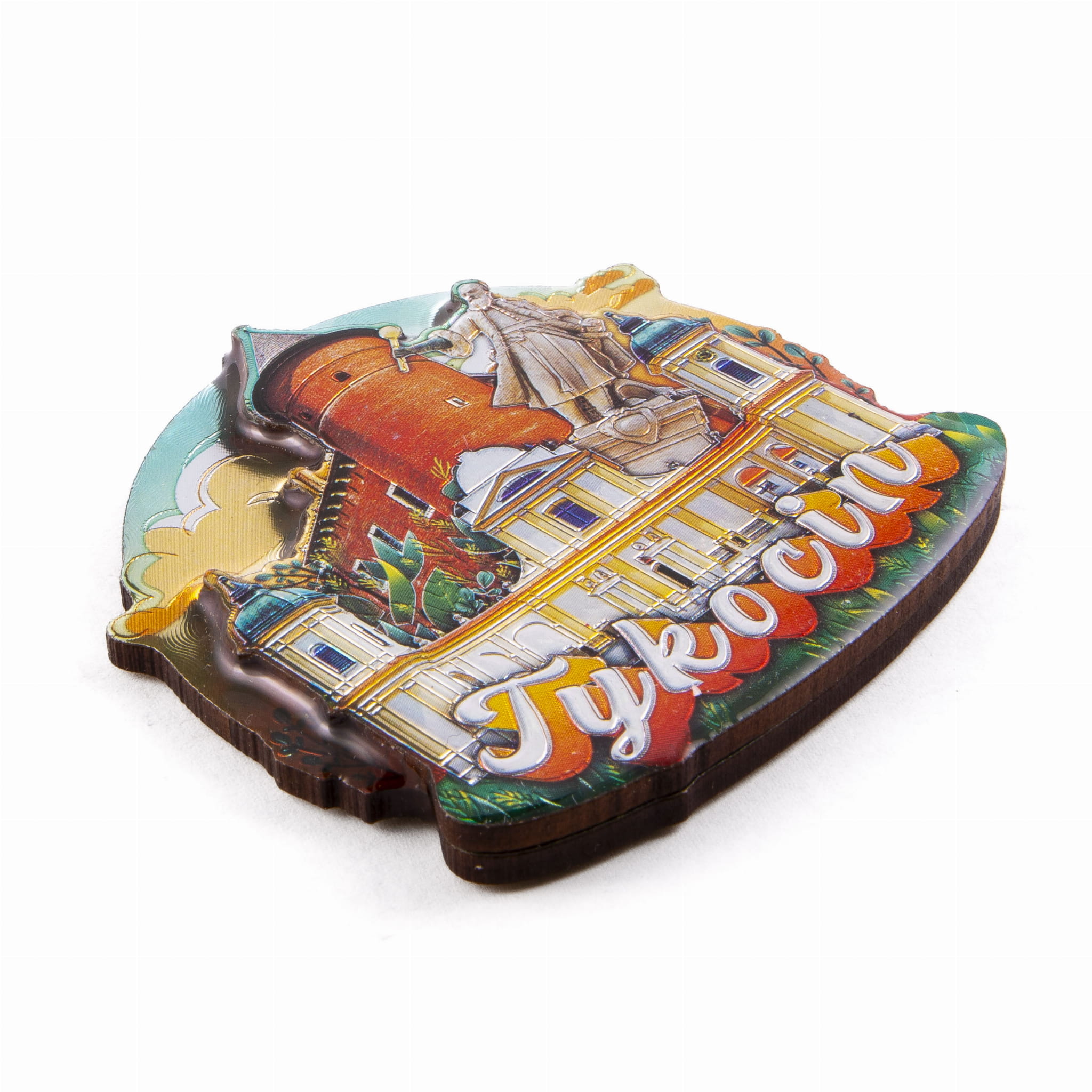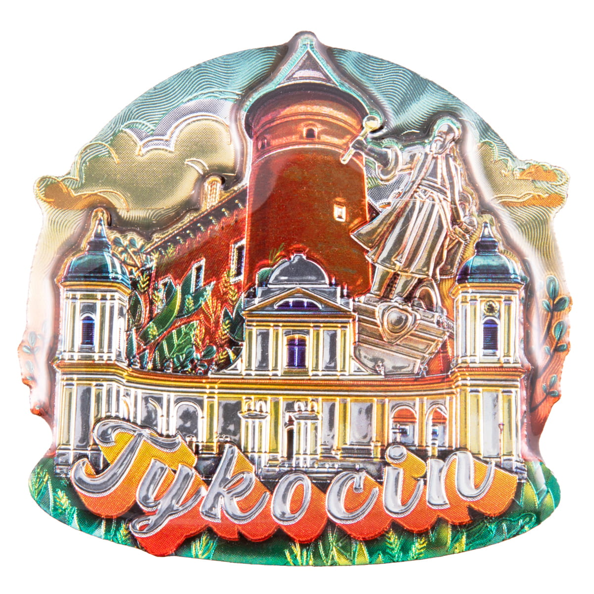 Wykonany z MDF dwuwarstwowy magnes metalizowany, przedstawiający panoramę Tykocina. Wśród prezentowanych na magnesie elementów zauważyć można między innymi pomnik hetmana Stefana Czarnieckiego i zamek. Widoczny jest na nim też wyraźny napis "Tykocin". Front magnesu zalany jest żywicą epoksydową zapewniającą trwałość kolorów i nadającą połysk. Na rewersie umieszczona jest duża, wysokiej klasy folia magnetyczna zapewniająca trwałe, bezpieczne umocowanie pamiątki na metalowej powierzchni.
