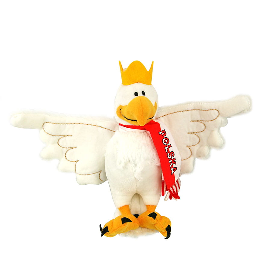 Pluszowa zabawka w postaci orzełka z koroną w biało czerwonym szaliku.