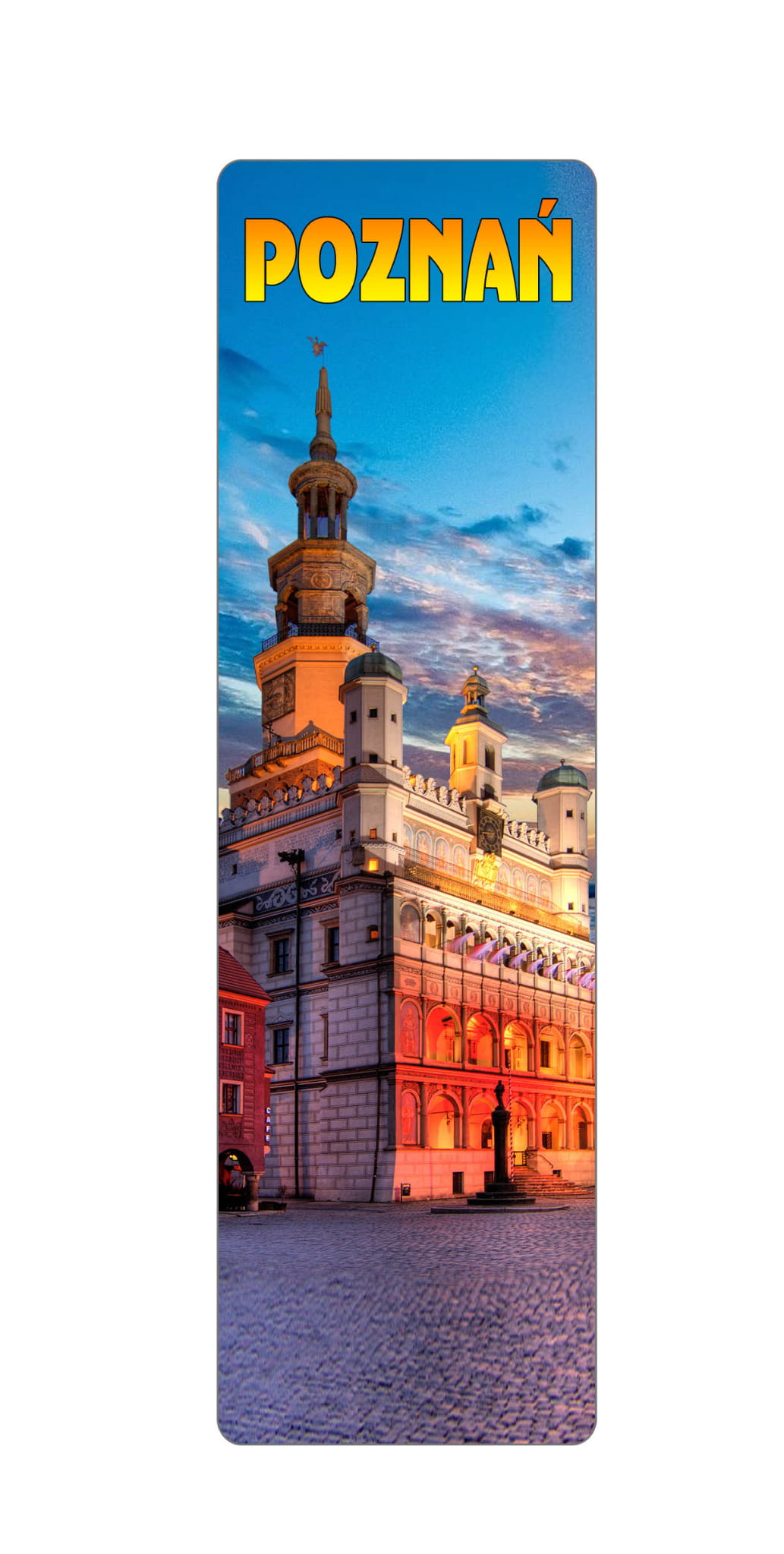 Zakładka do książki z nadrukiem dającym efekt głębi (3D), przedstawiająca widok z miasta Poznań. Na odwrocie zakładki wydrukowana jest linijka z podziałem na cale i centymetry. Dodatkiem jest zawieszka z frędzelkiem.