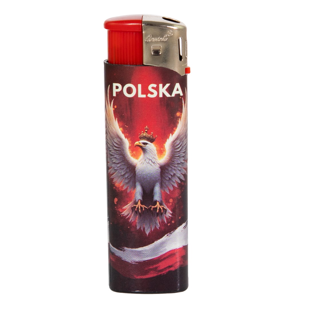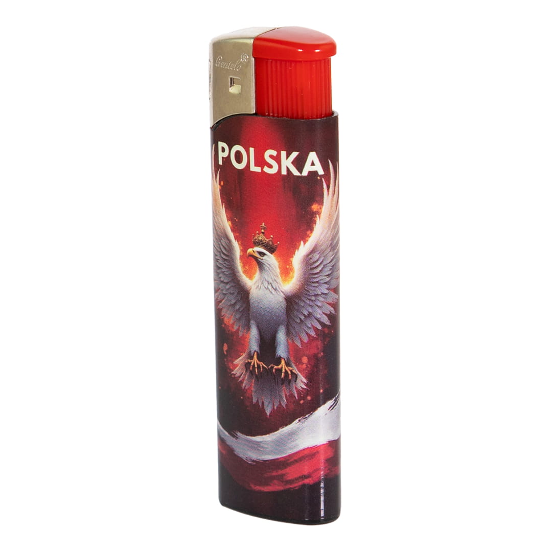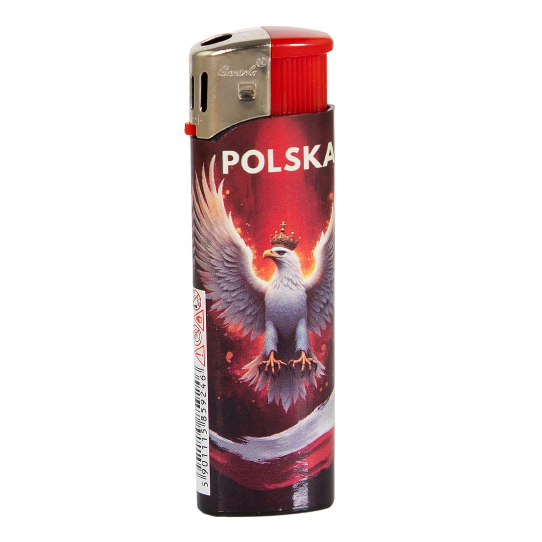 Elegancka zapalniczka na gaz w klasycznym kształcie na której znajduje się kolorowy nadruk o charakterze narodowościowym przedstawiający białego orła z biało-czerwonymi barwami.