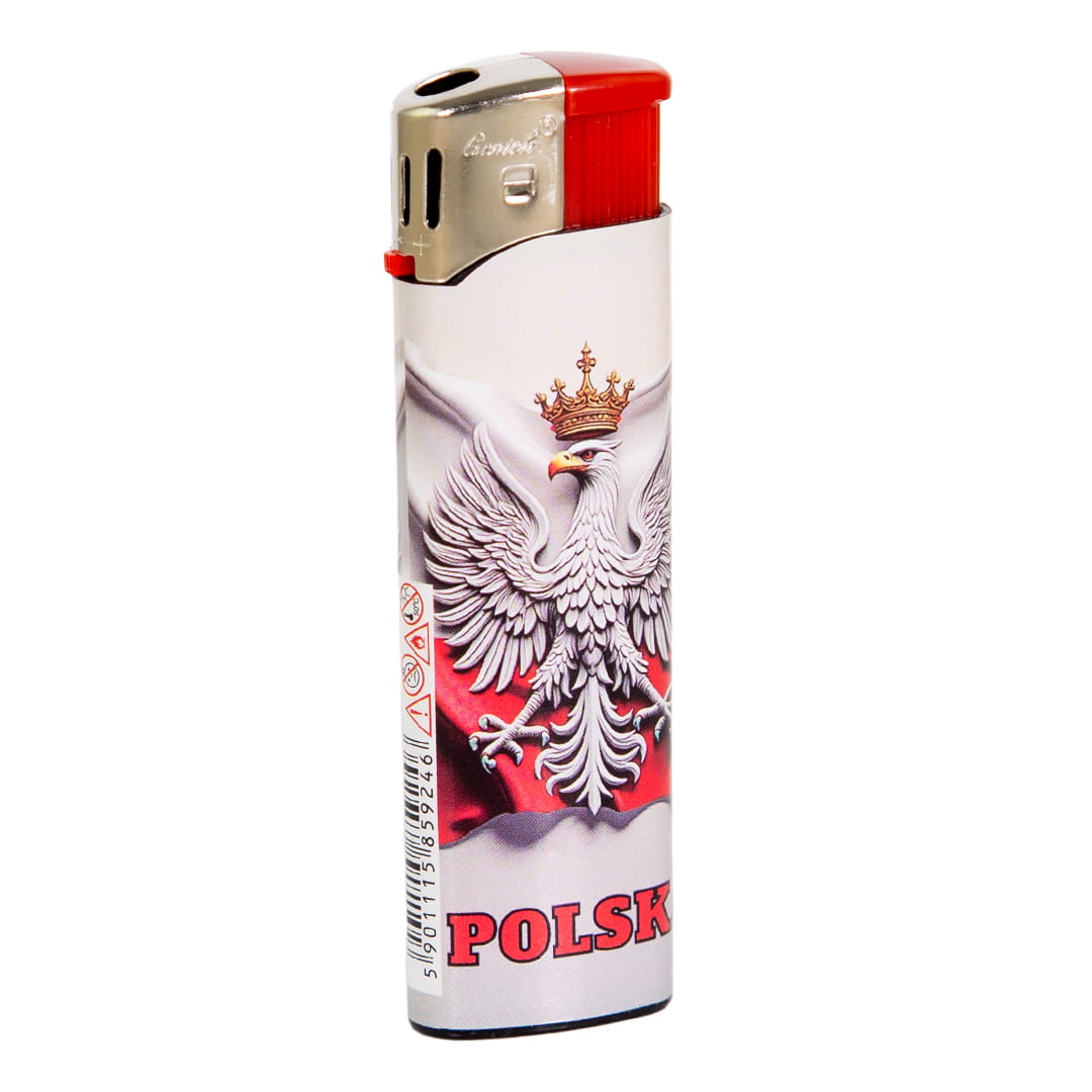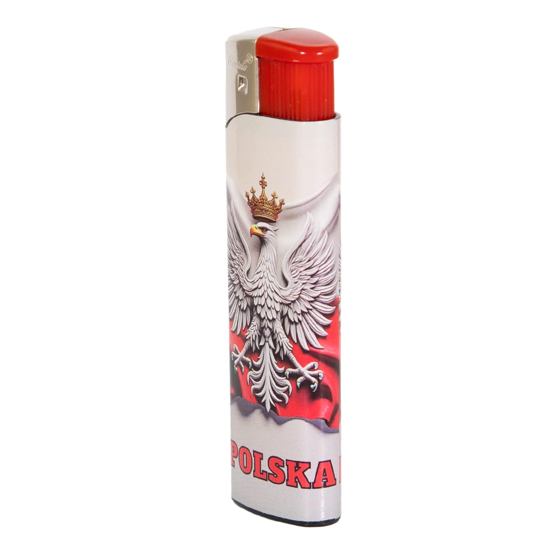 Elegancka zapalniczka na gaz w klasycznym kształcie na której znajduje się kolorowy nadruk o charakterze narodowościowym przedstawiający białego orła z biało-czerwonymi barwami.