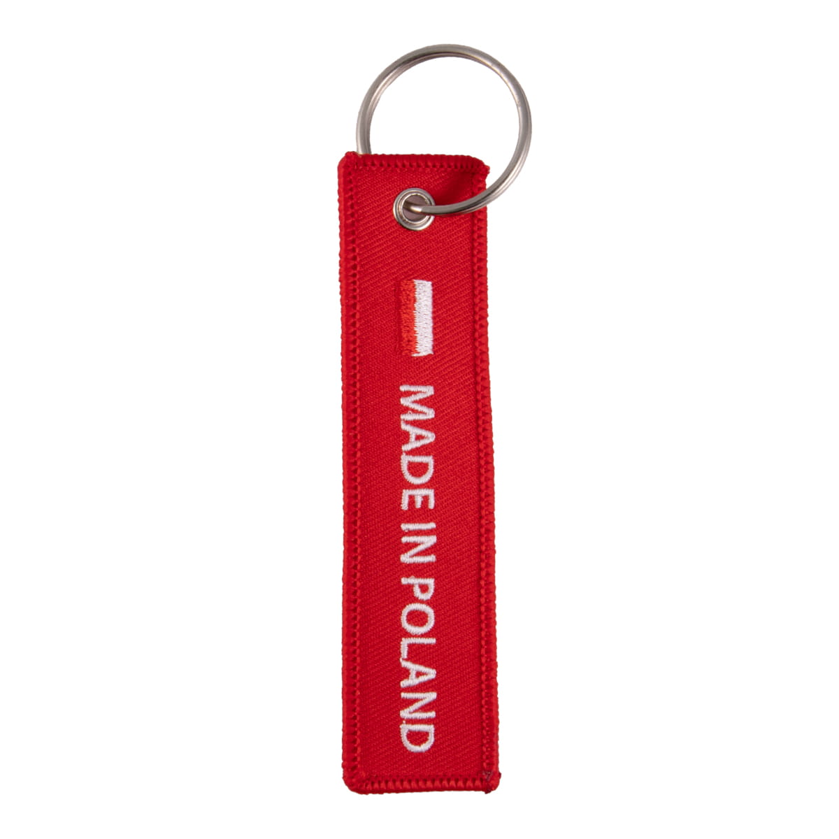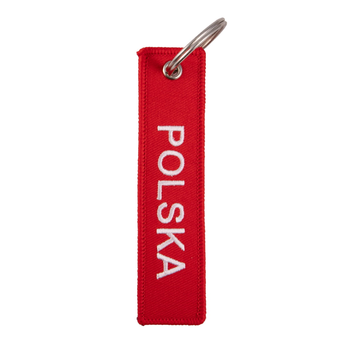 Haftowana, prostokątna zawieszka w stylu remove before flight, w kolorze czerwonym z wyraźnym białym napisem POLSKA. Na rewersie zawieszki znajduje się biało-czerwona flaga i napis MADE IN POLAND. Mocowanie zawieszki stanowi wysokiej jakości niklowane oczko umożliwiające bezpieczne przyczepienie jej do garderoby lub plecaka.