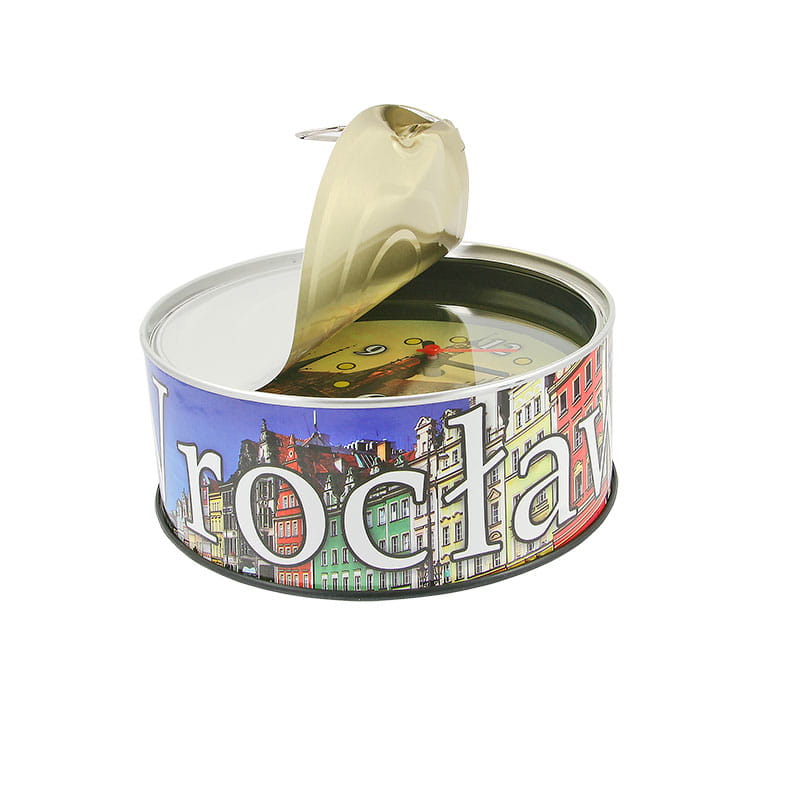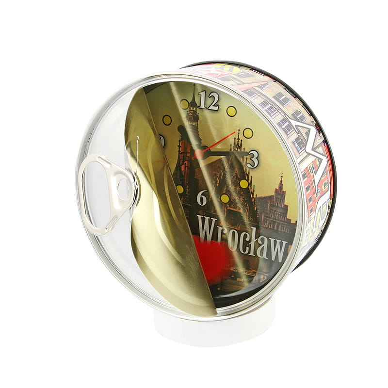 Zegarek zamknięty w ozdobnej puszcze z napisem I love Wrocław i herbem tego miasta - tarcza, przedstawiająca wrocławski ratusz, wyłania się po otwarciu wieczka.