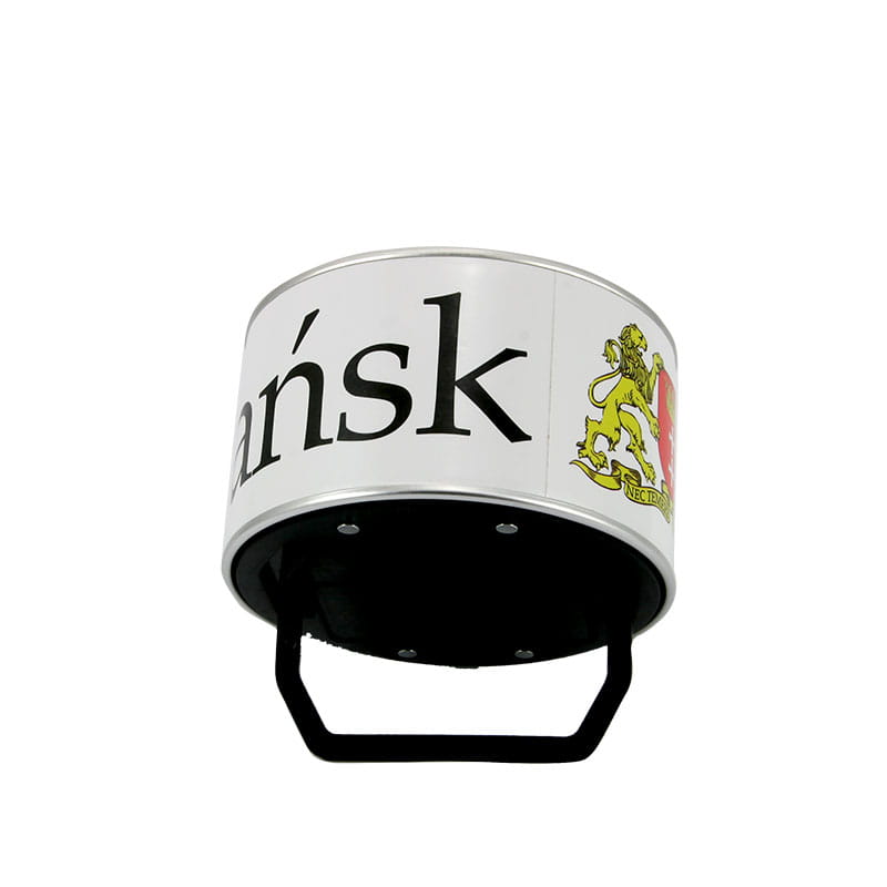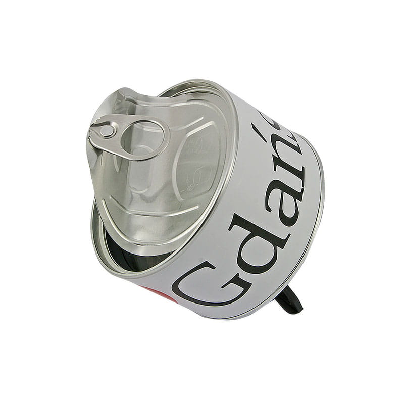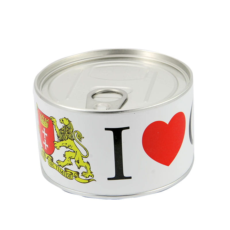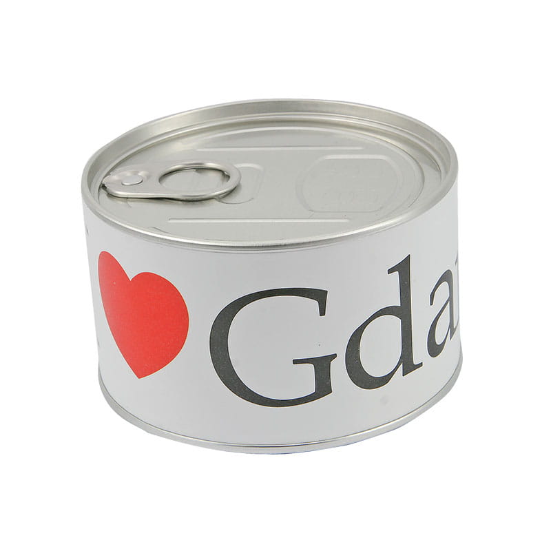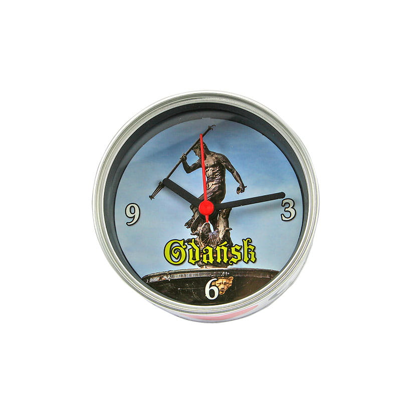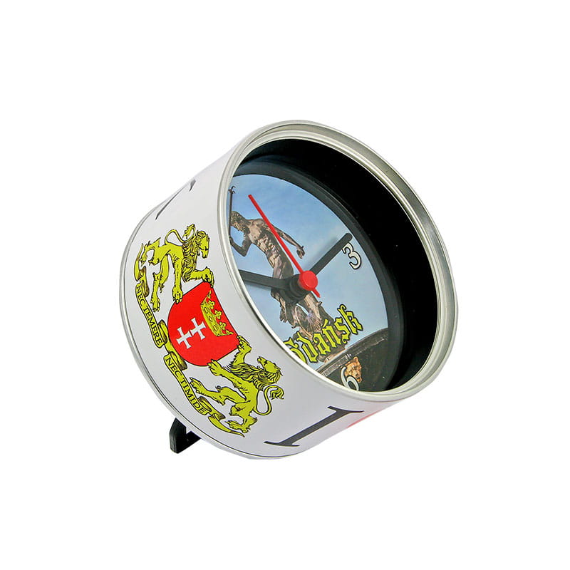 Zegarek zamknięty w puszcze z napisem I love Gdańsk i herbem tego miasta - tarcza, przedstawiająca Fontannę Neptuna, wyłania się po otwarciu wieczka.