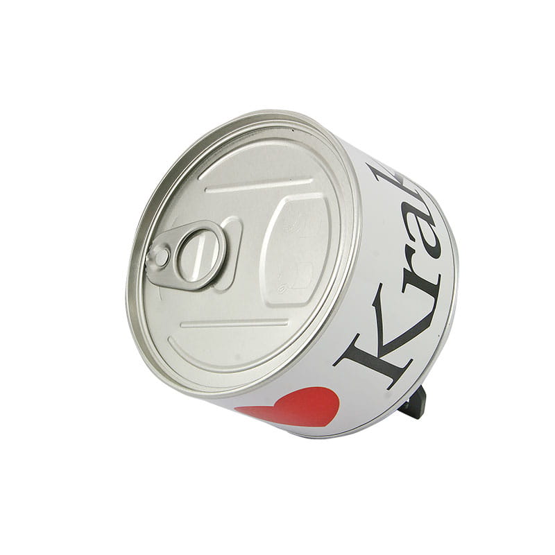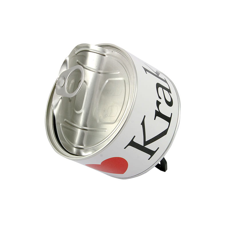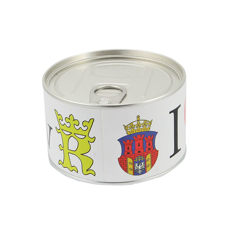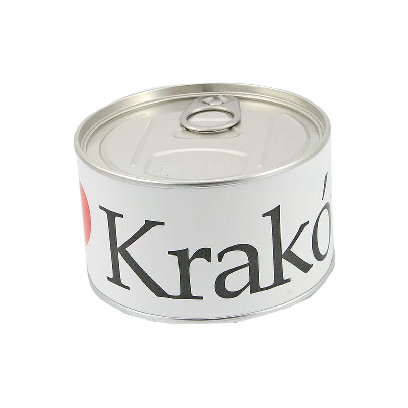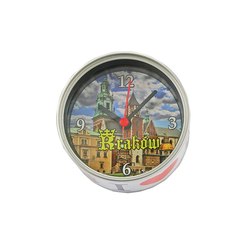 Zegarek zamknięty w puszcze z napisem I love Kraków i herbem tego miasta - tarcza, przedstawiająca Wawel, wyłania się po otwarciu wieczka.