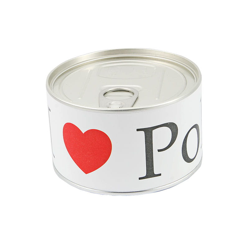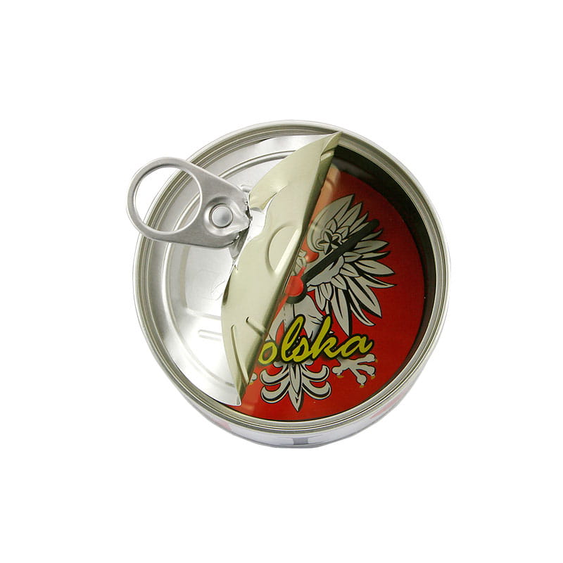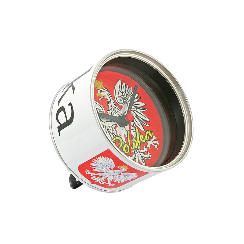 Zegarek zamknięty w puszcze z napisem I love Polska i godłem naszego kraju - tarcza, przedstawiająca polskiego orła, wyłania się po otwarciu wieczka.