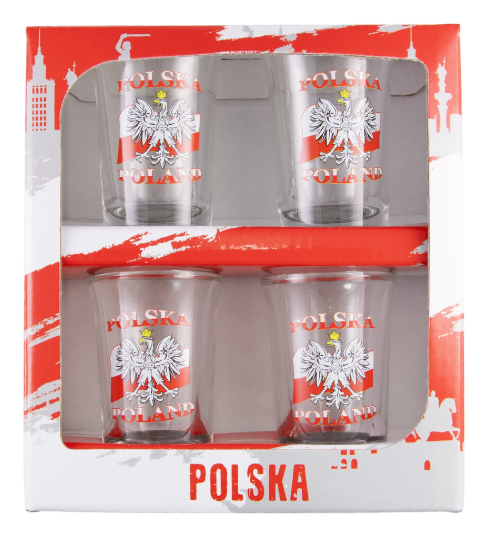 Zestaw 4 szklanych kieliszków do wódki ozdobiony nadrukiem przedstawiającym orła w koronie na tle biało-czerwonej flagi. Nad orłem znajduje się napis "Polska", a pod nim "Poland".